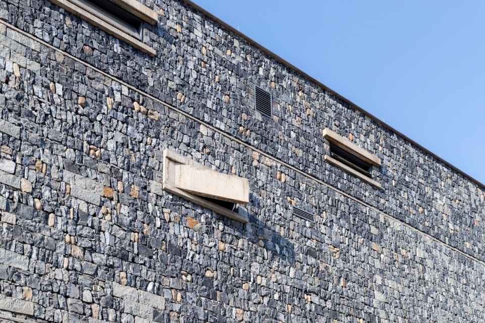 In effetti, visti dal lato opposto dello specchio d’acqua, da una distanza media, gli edifici sono presenti, ma sembrano far parte del paesaggio, piuttosto che essere stati inseriti al suo interno. È un tentativo credibile di fondere un museo moderno nel paesaggio naturale e di produrre una tipologia rurale in un vivace centro urbano.
