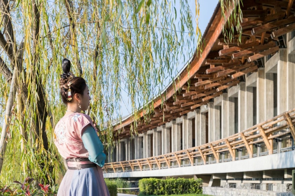 Si trattava di rendere un omaggio figurativo agli sforzi fatti dal re Qian per proteggere e preservare la regione dall’invasione. In questo modo, il sito doveva essere simbolicamente protetto e conservato. Per eliminare il rumore del traffico, gli edifici formano una barriera fisica lungo il bordo orientale dell’area, creando un’oasi di calma (salvo per le orde di turisti all’interno) e uno spazio chiuso per ospitare gli edifici nel vasto intervento paesaggistico.