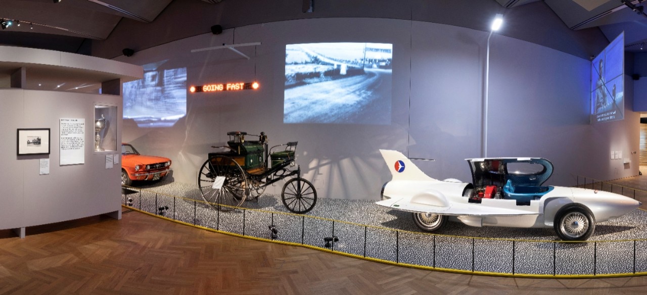 Tre sezioni della mostra mostrano come l'auto abbia influenzato il nostro rapporto con la velocità, sospingendo produzione di massa e consumismo, e abbia trasformato il nostro ambiente. Going Fast cattura il senso di ottimismo dell'avvento dell'auto - le copertine delle riviste raffigurano città trasformate dallo sviluppo di auto volanti e auto individuali a forma di bolla, e una Ford Mustang Fastback rossa lucida emana il fascino della velocità. Ma il passaggio alla sezione successiva ha un tocco più sinistro.