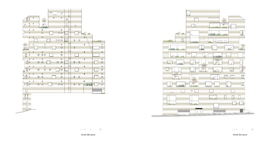 Il rivestimento dell’edificio, che molti recensori hanno paragonato al paesaggio devastato del Dopoguerra cittadino è, in realtà, un materiale di alto spessore accuratamente lavorato, che innesca un dialogo tra gli spazi interni e l’eclettico paesaggio urbano della città. Per arrivare a questo risultato il progetto ribalta la pratica locale di colmare gli angoli residui con contenitori di piante. Al contrario, i contenitori fanno parte dello spazio di ogni piano, sono elemento integrante dell’esperienza architettonica, progettati in rapporto con la loro collocazione nell’edificio e con i piani circostanti della strada. Il risultato è una massa di terra lavorata dalle qualità biologiche, punteggiata irregolarmente da profonde finestre che riflettono sulla strada le esperienze di vita di ciascun piano.