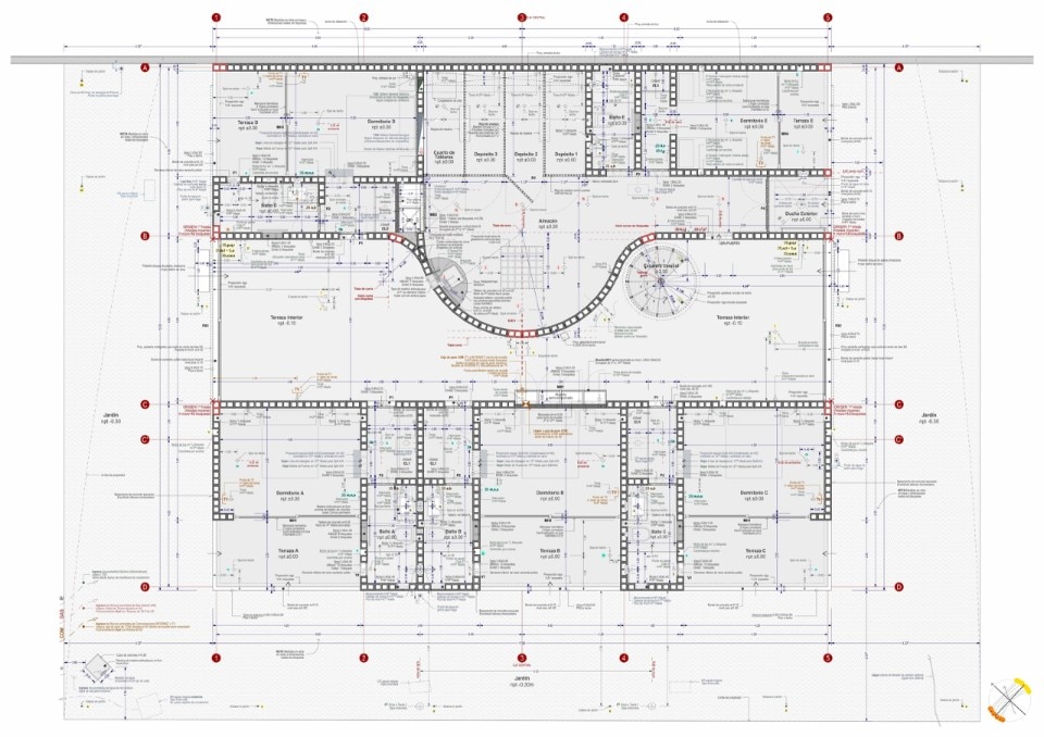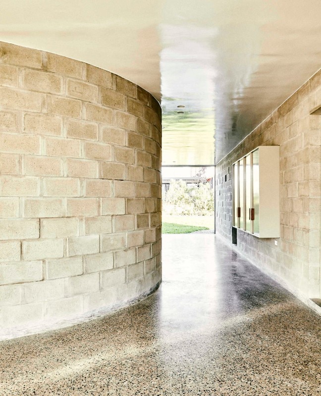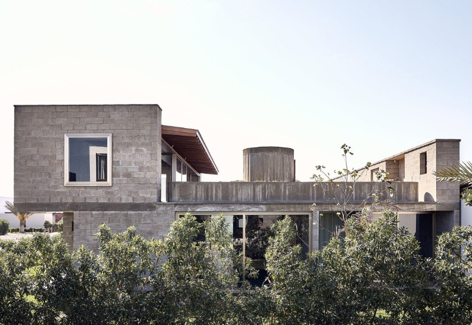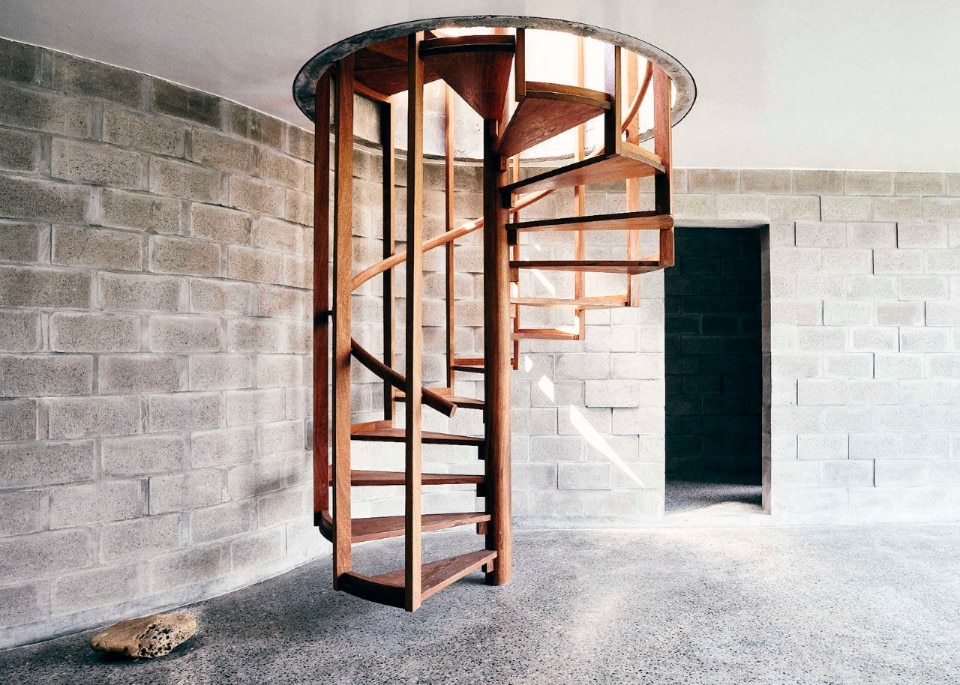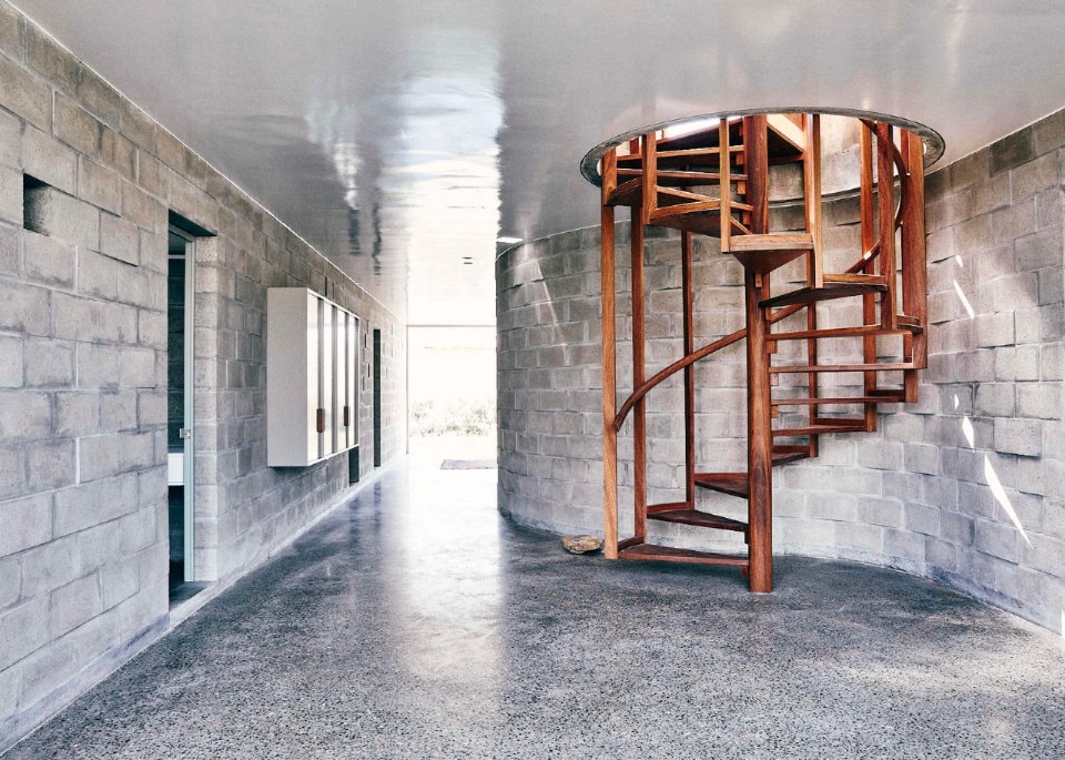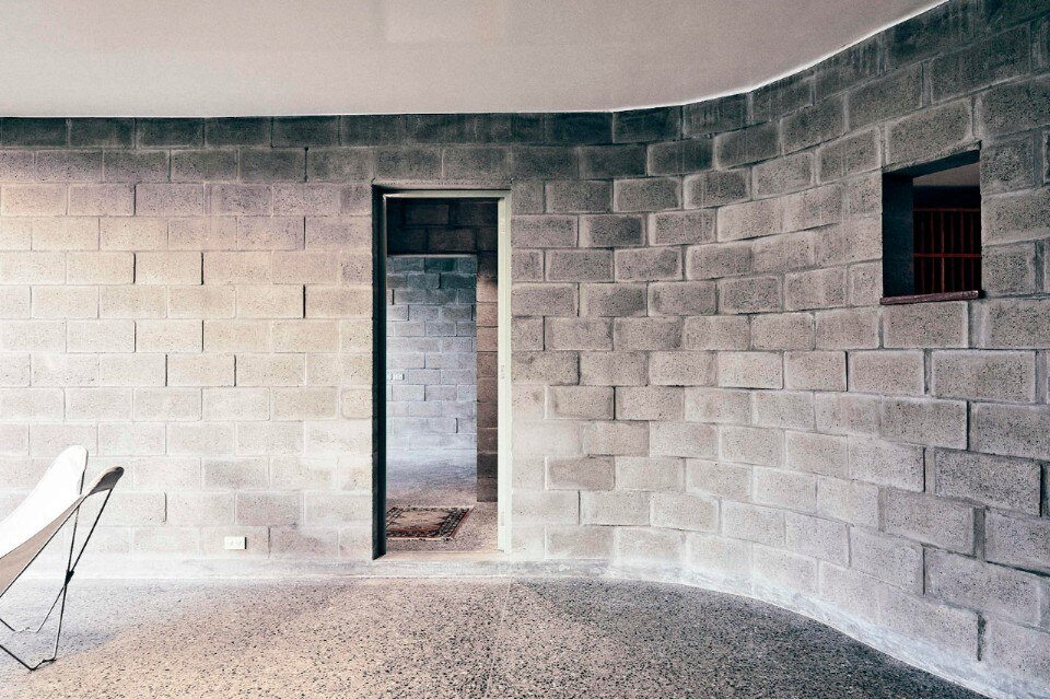 Al rigore di una pianta compatta e ripartita ortogonalmente, si contrappongono forme sinuose. Un muro curvo a piano terra definisce un fascia longitudinale interna fredda che serve le camere da letto, mentre la plasticità del cemento gettato in opera disegna il vano circolare della scala a chiocciola, la piscina e le vasche verdi sul terrazzo.