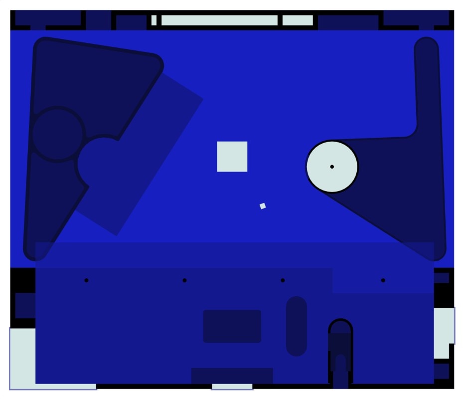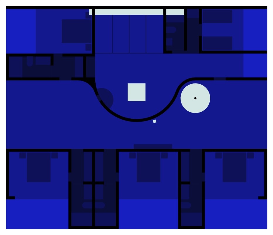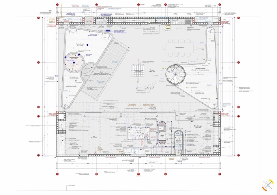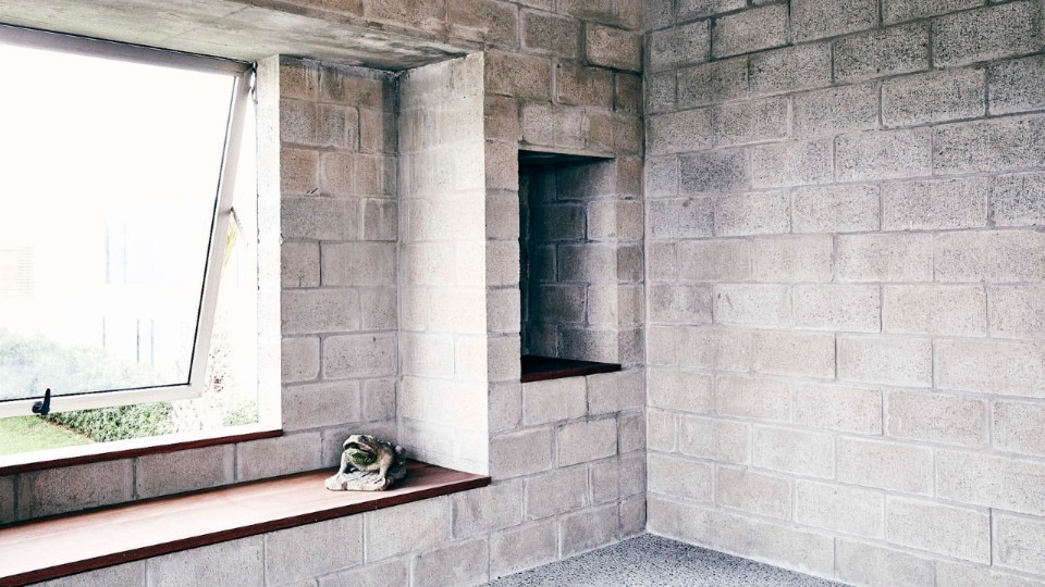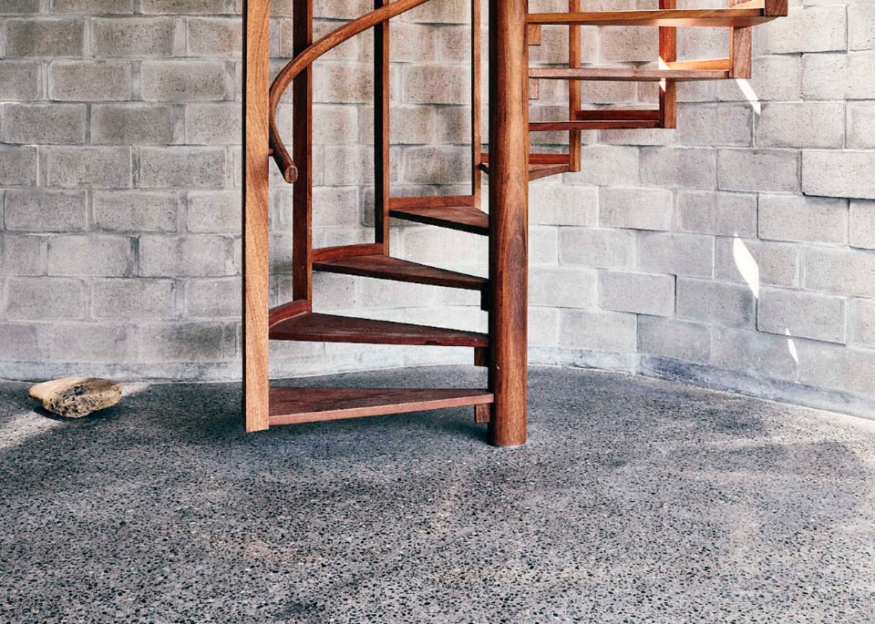 Al rigore di una pianta compatta e ripartita ortogonalmente, si contrappongono forme sinuose. Un muro curvo a piano terra definisce un fascia longitudinale interna fredda che serve le camere da letto, mentre la plasticità del cemento gettato in opera disegna il vano circolare della scala a chiocciola, la piscina e le vasche verdi sul terrazzo.