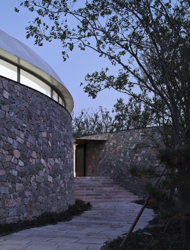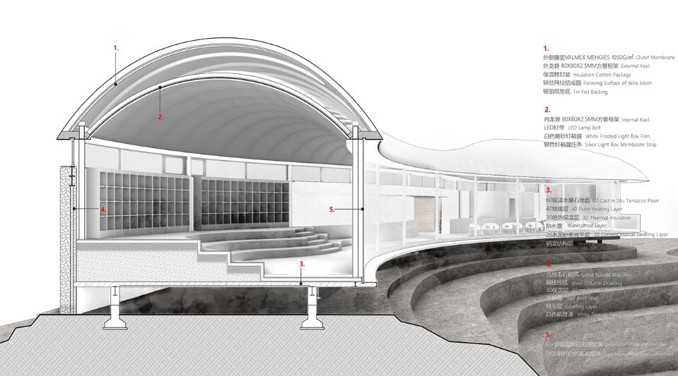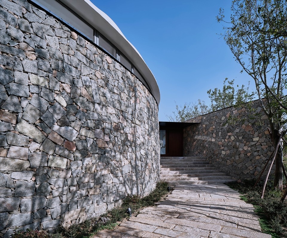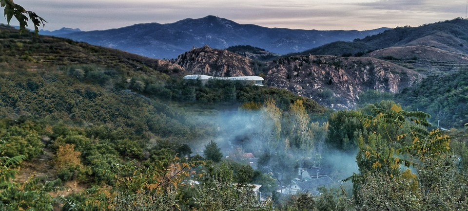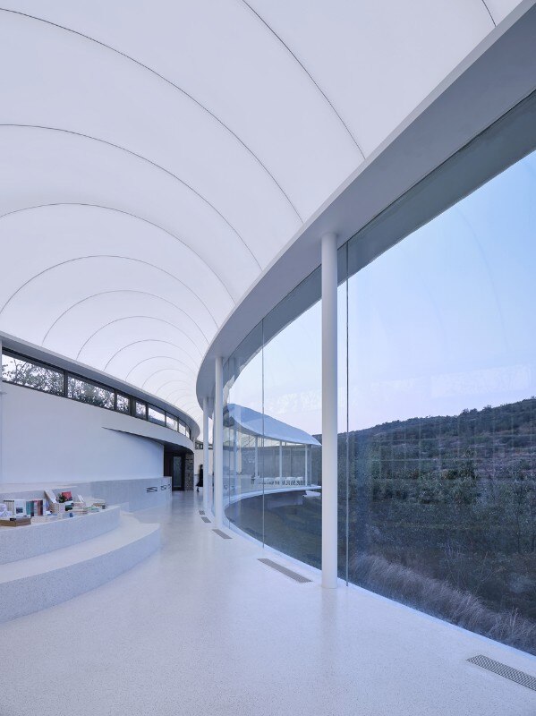 Ogni parte del progetto gode di una meravigliosa vista sulla vallata, sul villaggio e sulle montagne. Alle due estremità l’edificio si allarga leggermente e dispone di due terrazze panoramiche in cui si crea un senso di sospensione. Nel lato interno, all’intersezione con la collina, Studio Jiunvfeng presenta un muro solido e spesso, fatto di macerie locali, che sembra tenere l’edificio aggrappato al suolo, creando un forte contrasto tra materiali “pesanti” e leggeri”.