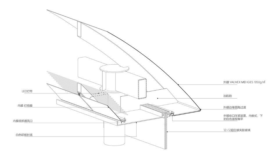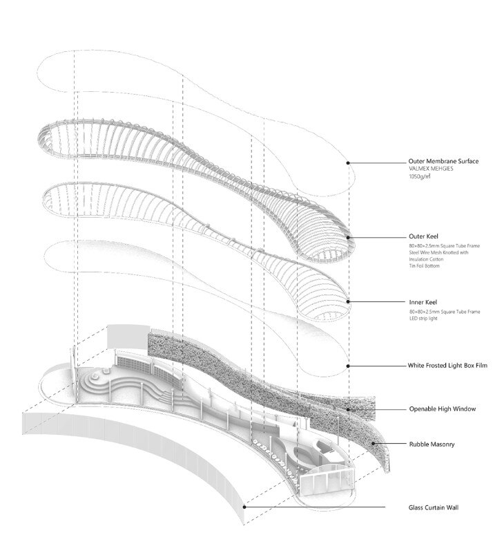La struttura è divisa in tre parti. La copertura è composta da una membrana bianca a doppio strato, disegnata da una serie di chiglie arcuate che danno una forma fluida, liscia e morbida al tetto.