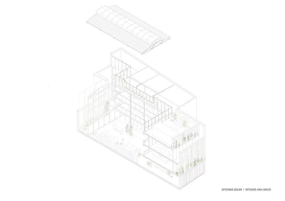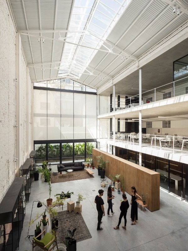 Il complesso è formato da due nuclei principali: il primo è un terratetto di quattro piani che in precedenza era utilizzato come residenza e che oggi contiene gli uffici dell’azienda. Questo primo nucleo ha un impianto a “L”, su cui poggia la sua estensione. Quest’ultima, una struttura industriale leggera, è un grande vuoto centrale e luminoso che ospita lo showroom.