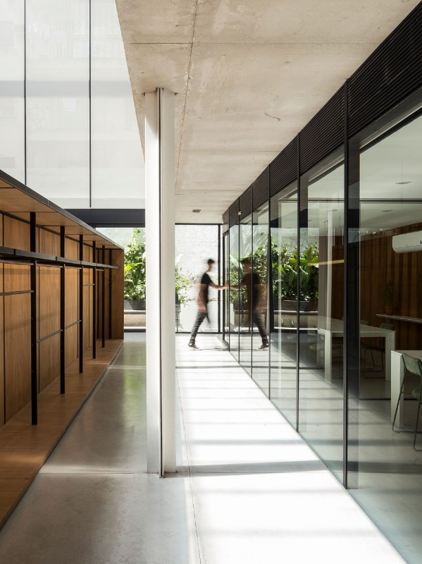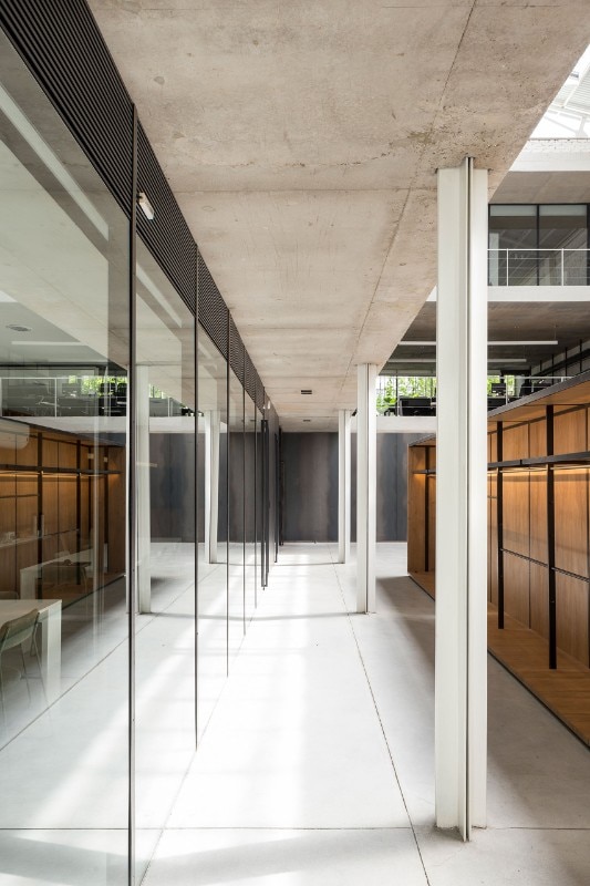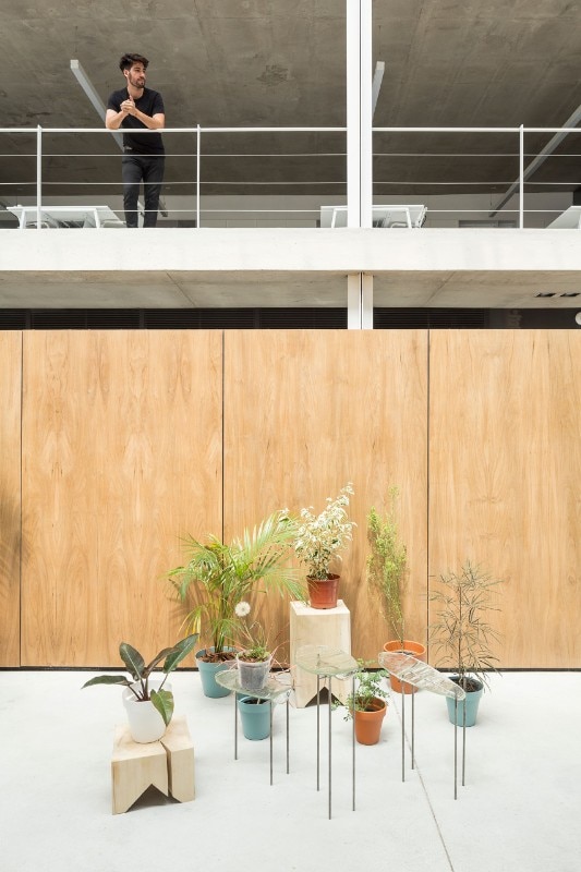 L’ingresso conduce dapprima all’area di ricevimento su un piano, dove la vista si apre verso l’area espositiva, luminosa e a tutta altezza. Questo ambiente è dominato dal bianco: dalle pareti di mattone dipinto, ai pilastri a croce di acciaio, fino ai solai di cemento chiaro. Lo spazio culmina con una facciata interamente vetrata che dà accesso al patio. Qui si sviluppa una seduta continua che argina una quinta scenica di piante.