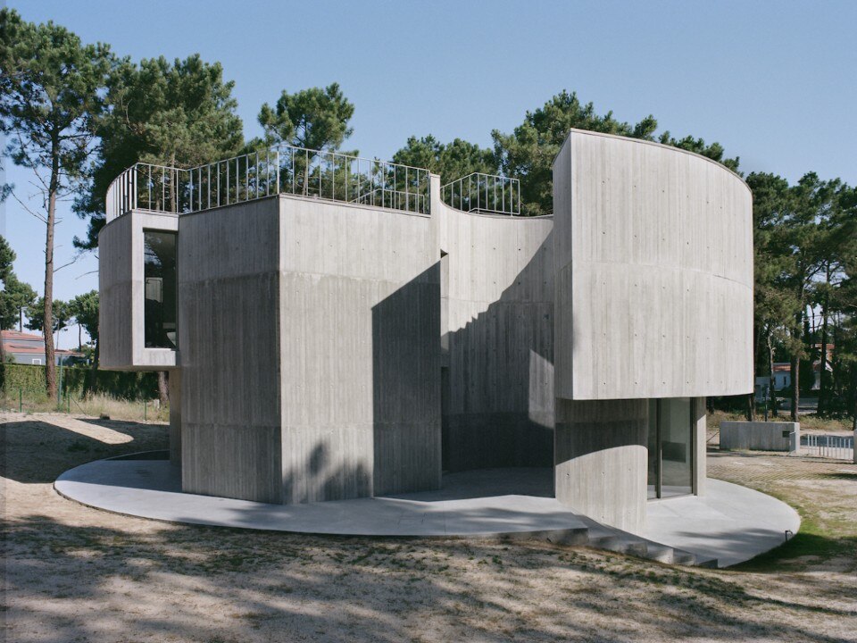 Trefoil House si trova in una pineta in prossimità dell’Oceano Atlantico, ad Aroeira, appena a sud di Lisbona, e al di là del fiume Tago. La casa a due piani progettata da Double O Studio per una coppia di pensionati che si trasferisce in Portogallo ha la forma di un cilindro di cemento da cui sono stati sottratti e aggiunti dei volumi. Questa forma frammentata, piena di angoli e proiezioni, fa parte dell’“approccio antifacciata” del progetto dello studio, che non ha un prospetto primario verso l’esterno.