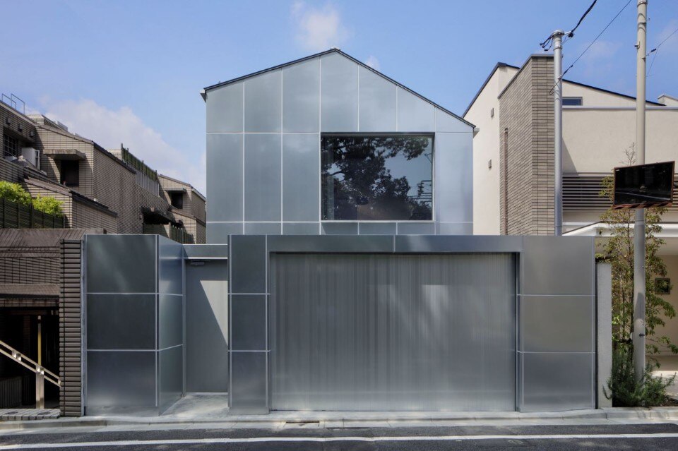 All’esterno la casa è rivestita in acciaio zincato, che dona alla struttura di legno un aspetto solido e uniforme. Le lastre d'acciaio riflettenti sono usate anche per la porta del garage e il terrazzo.