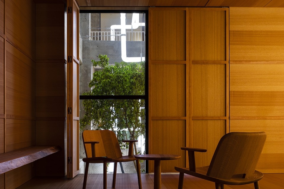 Con una fortuna nel campo degli occhiali grazie al marchio JINS, colosso dell’eyewear (che vanta collaborazioni con nomi quali Jasper Morrison, Konstantin Grcic e i fratelli Bouroullec) il patron Tanaka ha da sempre dimostrato una grande sensibilità e passione per il progetto e per l’architettura. Il Shiroiya Hotel ha aperto le porte poco più di un mese fa e, come la sua azienda, include una serie di interventi da parte di personalità di prestigio tra cui Michele De Lucchi, Jasper Morrison o l’argentino Leandro Erlich oltre ad accogliere opere di grandi artisti tra cui Hiroshi Sugimoto o Tatsuo Miyajima.