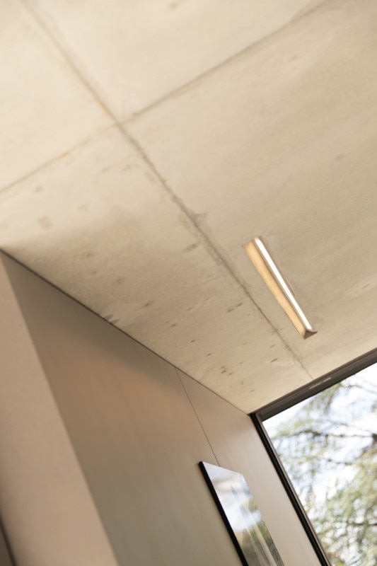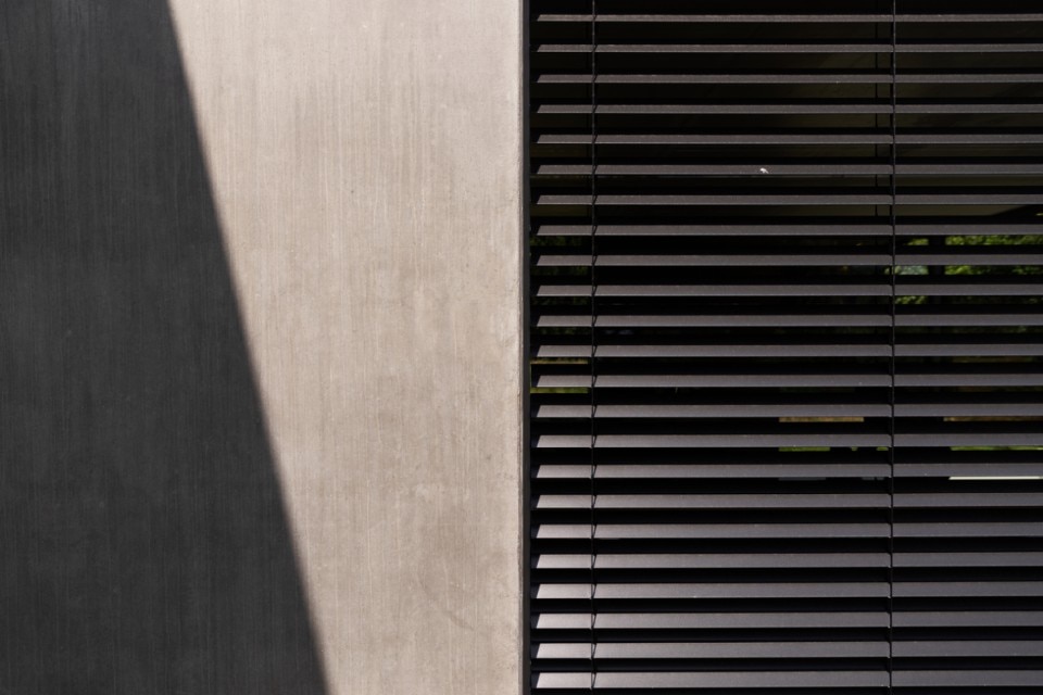 Un volume stretto e lungo – definito dall’alternanza di setti di cemento, superfici vetrate e dalle spesse fasce orizzontali che marcano la copertura e il basamento – si inserisce con garbo tra la casa, il giardino e la piscina.