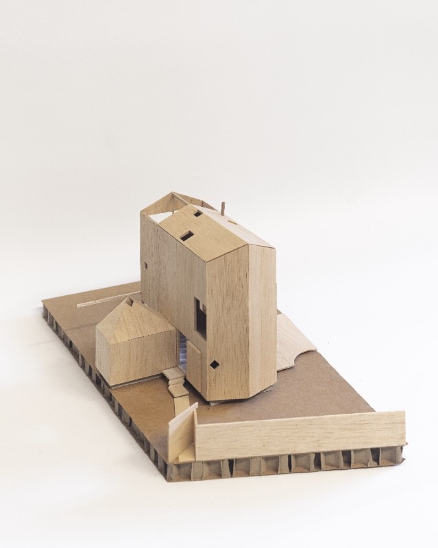 Tagli nel volume creano connessioni con l’esterno, aperture e scorci che rendono permeabili alcune delle facciate, definendo l’ingresso al piano terra e le finestre. I tre livelli della casa mettono a disposizione spazi comuni e privati, e si sviluppano attorno a un vuoto centrale – contenente le aree di circolazione e volto ad allargare percettivamente le zone comuni della struttura.