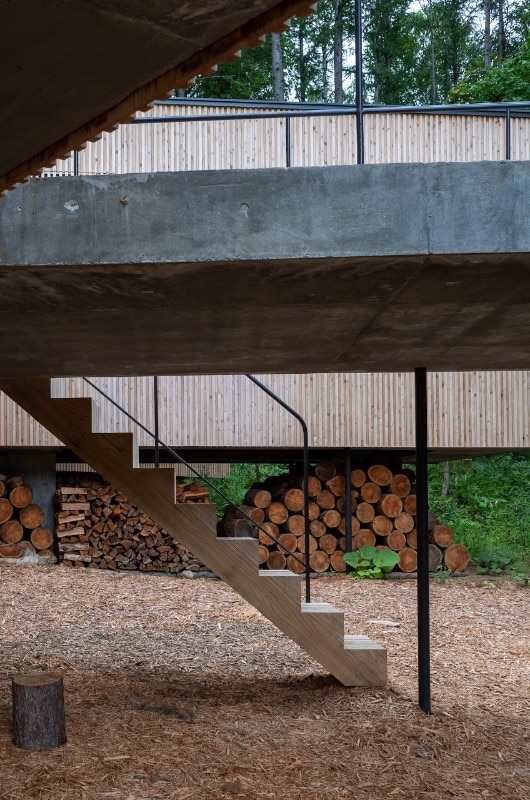 Per adattarsi all’andatura irregolare del terreno in modo silenzioso, l’architettura è sospesa su una rete strutturale di fini pilastri di acciaio, riprendendo la verticalità dei pini snelli circostanti. Matericamente i prospetti esterni sono caratterizzati da un rivestimento ligneo, in contrasto con il bianco degli ambienti domestici interni.