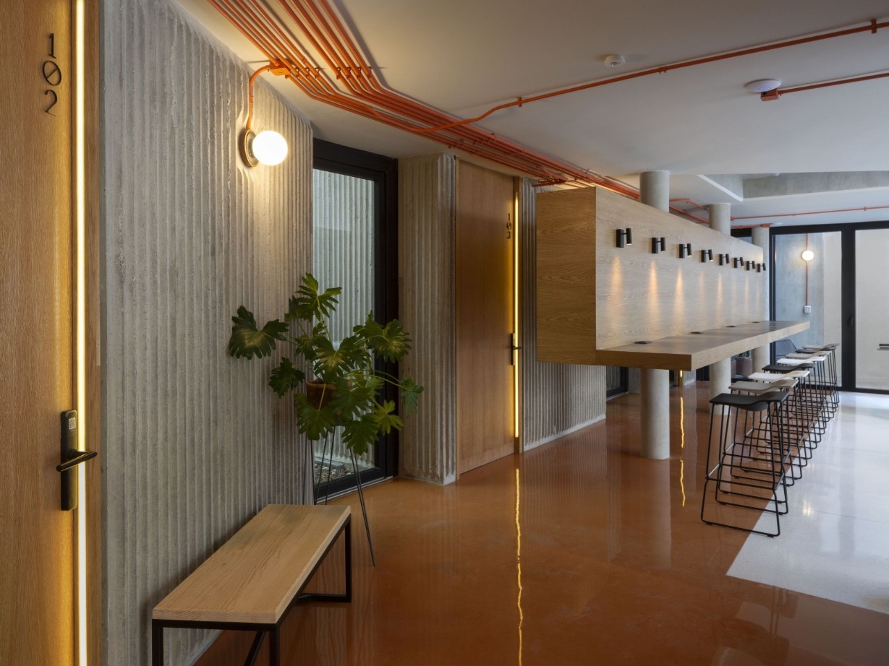 La definizione degli interni nasce da uno studio accurato delle spazilità e dall'accostamento espressivo dei materiali. La scelta di A-001 Taller de Arquitectura è quella di giocare con il tratto grafico e la qualità tattile delle superfici orizzontali e verticali: il pavimento liscio e lucido di resina si accosta alle pareti ruvide del cemento ondulato e alla texture calda dei mobili fissi che modellano le stanze e creano i percorsi.