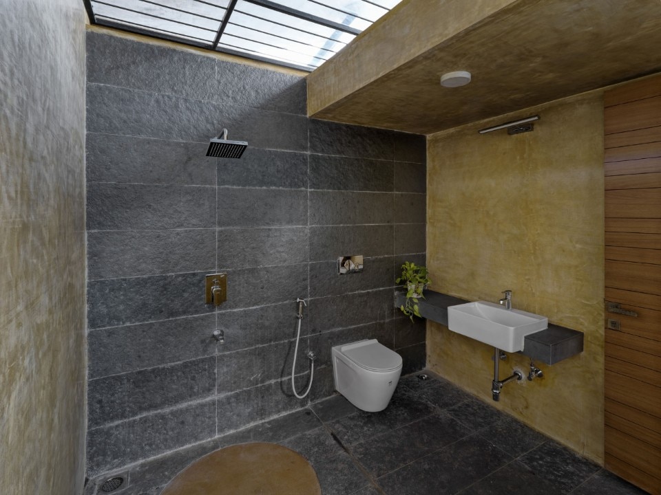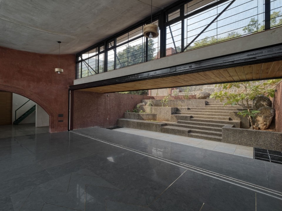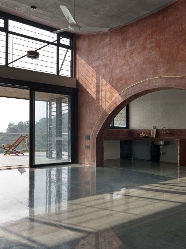Materiali locali e naturali sono prescelti in modo che il passare del tempo non lasci segni impietosi sull’opera ma la renda sempre più un unicum con la vallata: il rivestimento esterno in graniglia con pigmento rosso intenso permette alla casa di fondersi mimeticamente con le tonalità della regione mentre la finitura grezza garantisce, oltre ad un carattere materico, una buona resistenza alle piogge monsoniche.