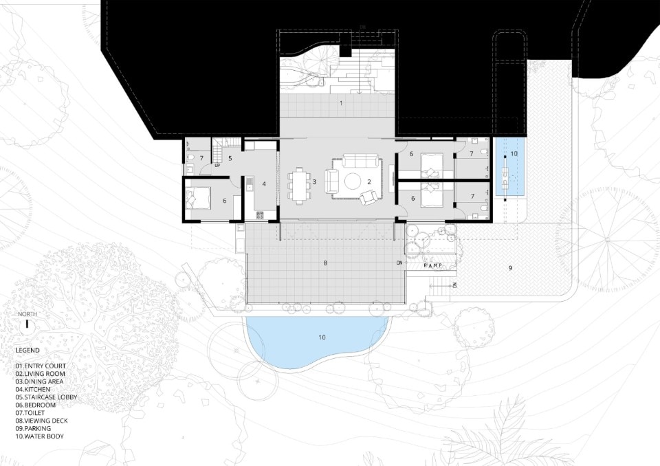 Una vasta terrazza panoramica prosegue la zona comune all’aperto fungendo da filtro tra natura e architettura; aree a verde con vasche d’acqua completano l’allestimento paesaggistico con zone di sosta per godere di momenti di convivialità in diretta comunicazione con il paesaggio.