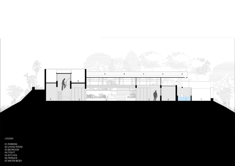 Il fabbricato segue l’andamento orografico del suolo: l’accesso avviene dalla quota sopraelevata attraverso una gradonata che conduce al cortile interrato; da qui, si apre la vasta zona giorno interamente vetrata con visuale aperta sulla vallata e sulle risaie, e su cui lateralmente si dispongono gli ambienti più intimi della zona notte. Il sistema di chiusura del soggiorno, costituito da pannelli in metallo interamente a scomparsa, garantisce la continuità tra interno ed esterno senza alcuna interruzione.