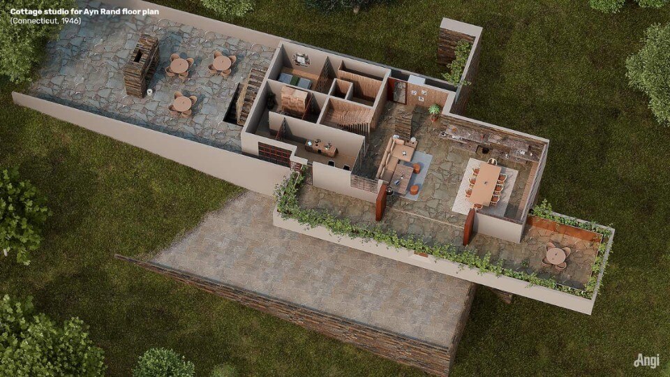Mrs. David Devin House, a Chicago, è un progetto del 1896, scelto dal team di Angi per i dettagli della pianta e della struttura, che “appare bella e in qualche modo diversa da quella delle altre case non costruite di Frank Lloyd Wright”. Cottage Studio for Ayn Rand, nel Connecticut, è stata disegnata nel 1946 per la scrittrice e filosofa Ayn Rand. La casa sarebbe stata dotata di uno studio all’ultimo piano, luminoso e aperto sul paesaggio, di rampicanti e fontane, mentre volumi e terrazze aggettanti si sarebbero incontrati secondo uno schema asimmetrico, poggiando su una collina.