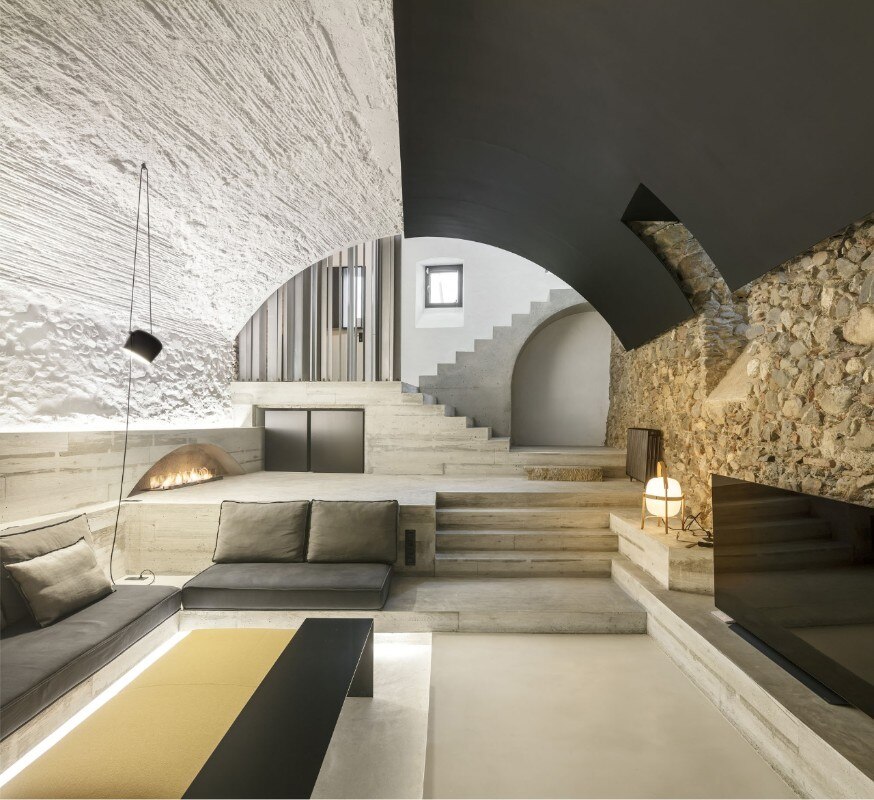 Il progetto prevede la collocazione, al primo livello, di un’ampia sala giorno; il collegamento tra i due edifici, situati a quote diverse, è risolto con un gioco di alzate in cemento liscio che creano una piattaforma pavimentale uniforme in contrasto con la scabra matericità delle pareti lapidee e della volta: tra i dislivelli, si adagiano l’ampio divano, la zona camino e la zona cocktail rifinite con elementi d’arredo essenziali ed eleganti.