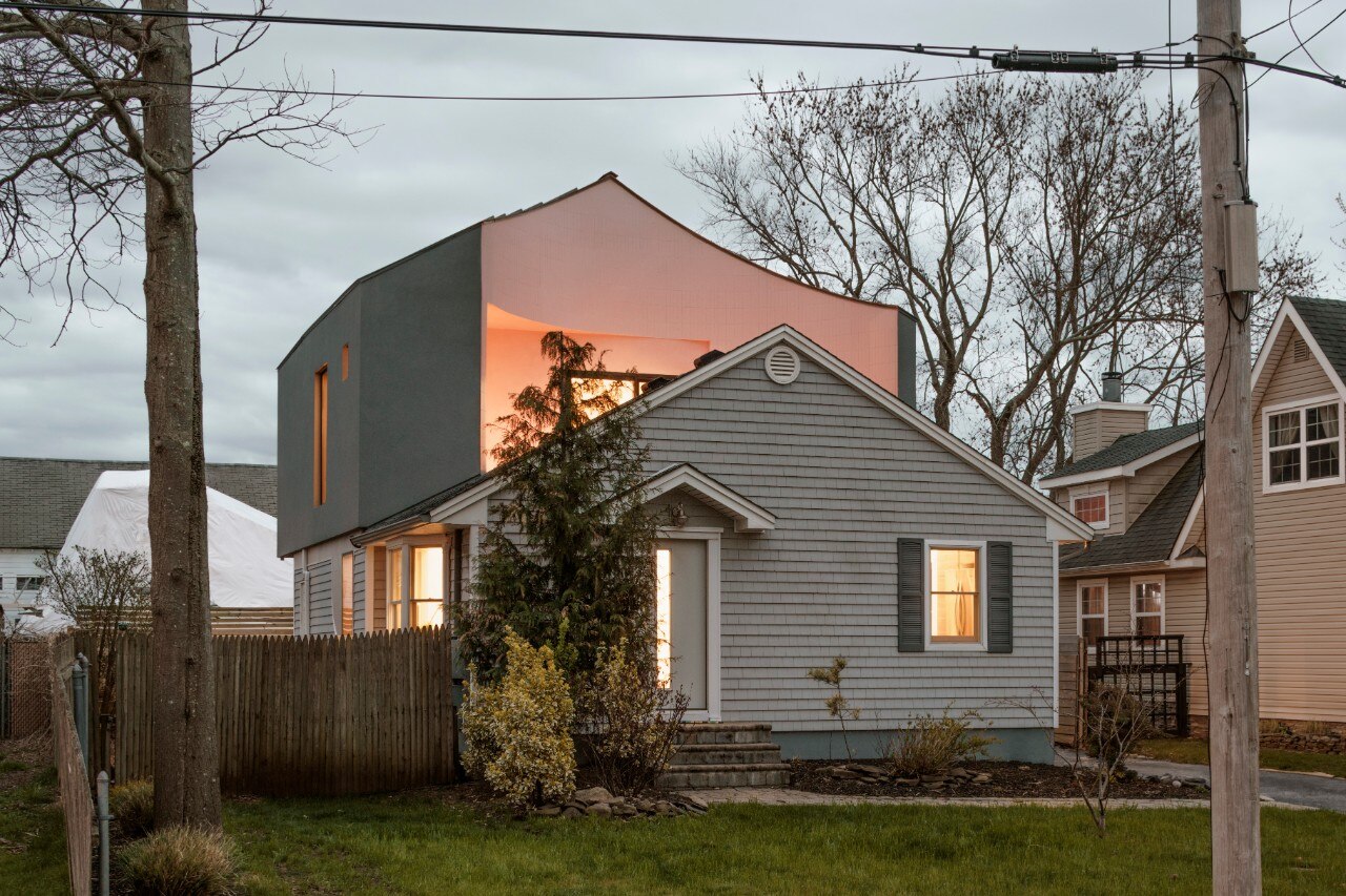 Architensions sconvolge una tipica casa unifamigliare di Long Island con una sopraelevazione non ordinaria. Un committente coraggioso lascia carta bianca allo studio di Alessandro Orsini e Nick Roseboro per elaborare un’architettura apertamente “critica” verso l’american way of life e gli standard del mercato, che lo traducono in abitazione.