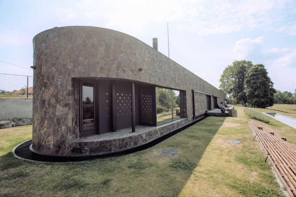 L’idea progettuale è quella di schermare il più possibile la villa dal suo contesto posteriore dove sono presenti altre costruzioni, aprendola invece maggiormente verso il paesaggio anteriore dove inizialmente era prevista una piscina stretta e lunga 50 metri. Nonostante non sia stata realizzata, la sua presenza ha pregiudicato la geometria dell’edificio. Restano invece alcune attrezzature per la vita all’aperto – una pergola, un angolo barbecue per gli onnipresenti cevapcici piccanti della cucina balcanica – che sottolineano comunque l’andamento lineare dell’impianto. Secondo Vesnić quest’ultimo è perciò “la reminiscenza di una striscia d’acqua scintillante che dà spazio alla contemplazione e sostiene il piacere di stare di fronte alla villa”.