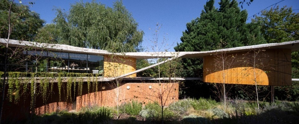 La casa è dotata anche di uno studio con accesso indipendente e di una stanza per gli ospiti. Il progetto ha utilizzato cemento, mattoni e legno che rivestono le pareti ondulate dell’edificio, ma anche grandi vetrate per la luce naturale.