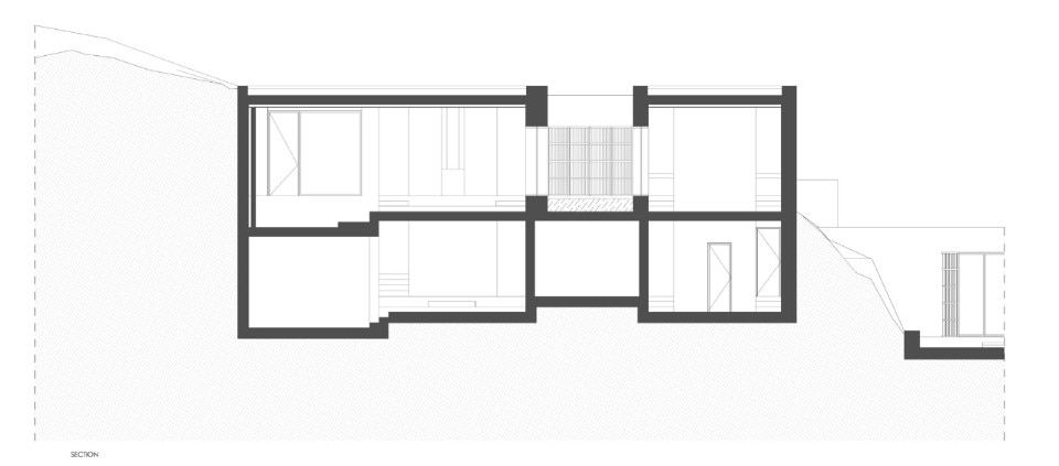 Per soddisfare le esigenze funzionali della committenza riducendo l’impatto del costruito sul territorio, l’edificio è composto da volumi distinti che seguono l’andamento orografico del sito: i due centrali a doppio livello separati da un percorso di collegamento coperto e in asse con la scalinata di accesso, che ospitano le principali funzioni abitative, e i due laterali a un solo livello che comprendono le camere per gli ospiti.