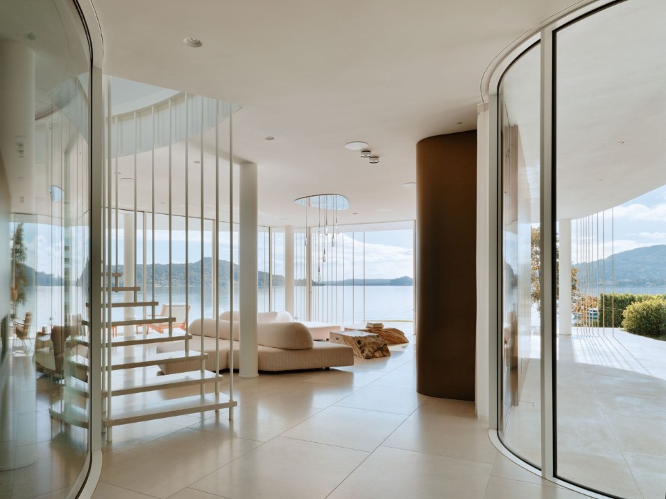 Gli interni sono connotati da una tavolozza neutra come per esaltare l’aura “ascetica” dell’abitazione in rispettosa contemplazione del paesaggio, tinteggiato del blu del lago e del verde delle montagne; il travertino utilizzato in finiture e rivestimenti conferisce una consistenza tattile agli ambienti diafani e immateriali.