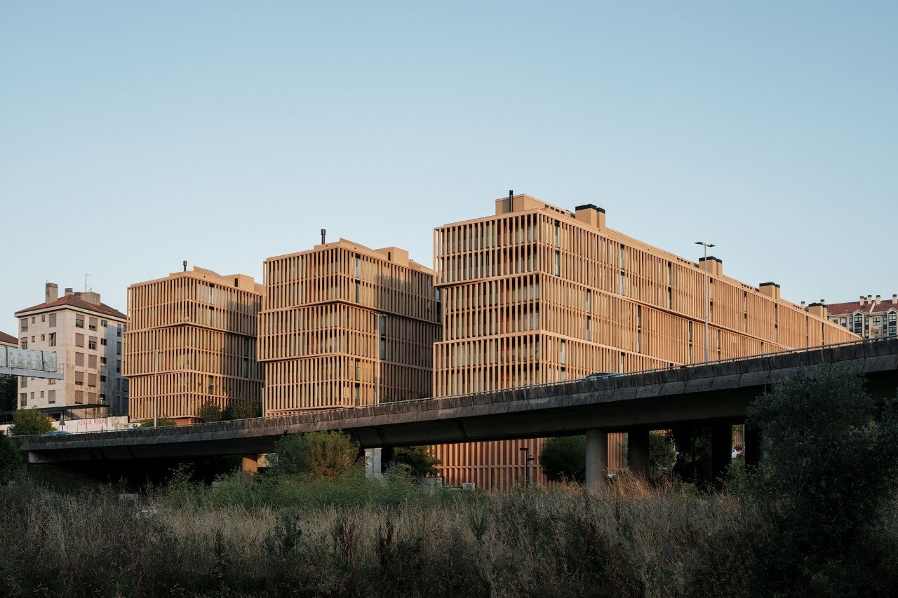 Nell’area della vecchia stazione ferroviaria di Cornes, in adiacenza al vecchio edificio ora recuperato che ospita le sedi di associazioni locali (“Casa das Asocacións”), lo studio con base a Santiago de Compostela Carbajo Barrios ha progettato un consistente intervento di edilizia residenziale: il complesso si compone di tre monolitici volumi, di dimensioni tra 70 m e 100 m di lunghezza e 12 di larghezza, a impianto longitudinale e tra loro paralleli, che ospitano 125 appartamenti di 22 diverse tipologie (dai duplex agli alloggi ad un piano) distribuiti in sei piani fuori terra, e box e parcheggi in due piani interrati; una sala giochi, una palestra e uno spazio polifunzionale completano l’opera offrendo spazi per la vita comunitaria.