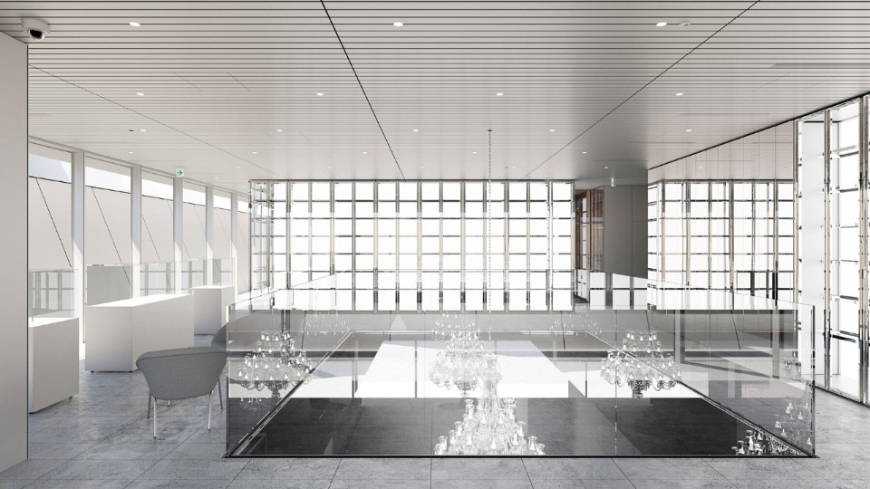 Per ridurre l’introspezione, smorzare l’impatto acustico e controllare l’irraggiamento, le facciate sono scandite ad ogni piano da superfici inclinate rivestite da lastre in alluminio e completamente cieche. I piani obliqui presentano altezze variabili a seconda dei livelli, stemperando verso l’alto la serrata chiusura dei fronti e consentendo un diversificato rapporto con l’esterno: se ai livelli inferiori, a contatto diretto con l’intorno, le schermature sono alte e non lasciano spazio ad alcuna percezione dell’esterno, a quelli superiori le dimensioni delle pareti inclinate si riducono lasciando filtrare lo sguardo, attraverso le vetrate, sul paesaggio urbano. L’ inclinazione studiata ad hoc delle superfici consente inoltre di captare e diffondere la luce e la ventilazione naturali.