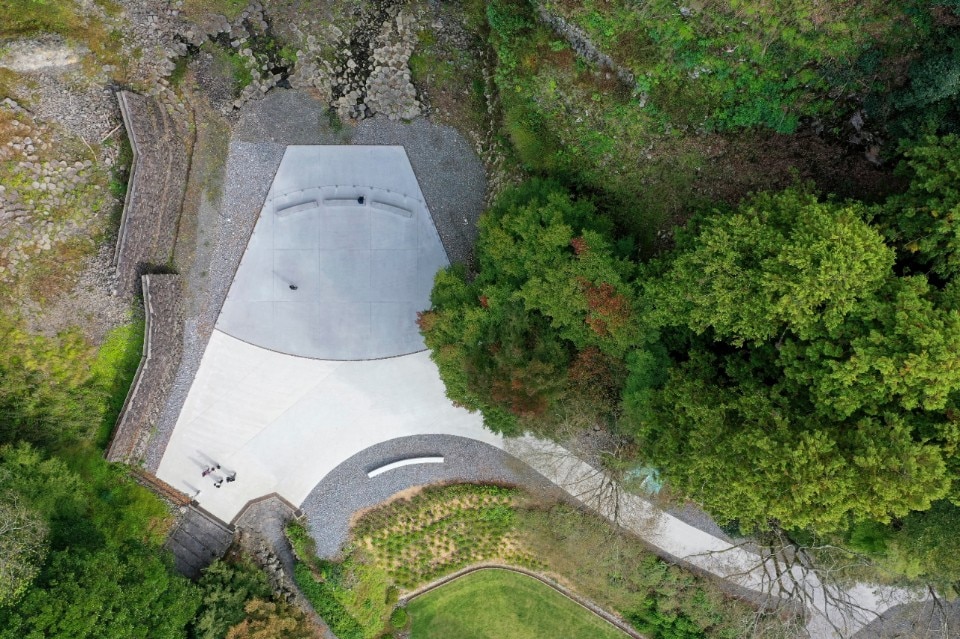 Fulcro del progetto, le piattaforme di cemento sabbiato di fronte alle grotte “Genbu-do” e “Seiryu-do”, le sedute da cui osservarle e i percorsi che attraversano l’area, anche questi in cemento grezzo. Le superfici pedonali, caratterizzate da tonalità di grigio, seguono il percorso naturale proponendosi come piazze pubbliche e punti di osservazione.