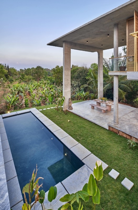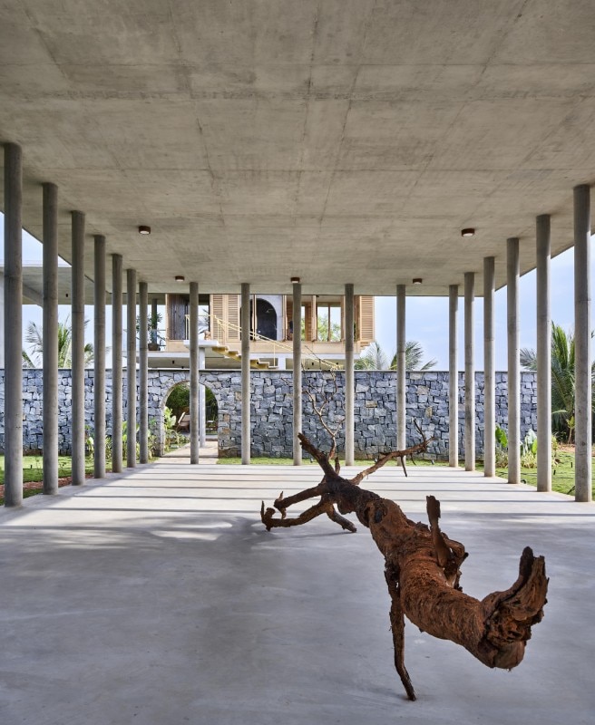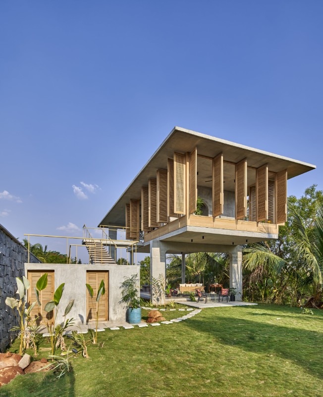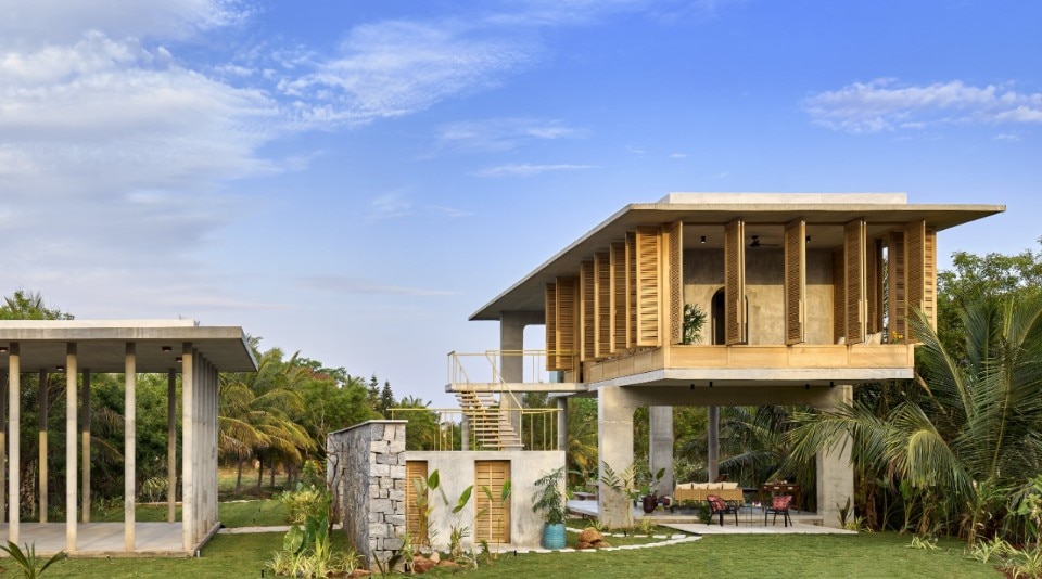 Immerso tra rigogliose piantagioni di cocco e areca, aperto sulla collina Savandurga a Bengaluru, in India, Ksaraah è un rifugio per i fine settimana che si fonde con la natura eliminando i confini tra interno ed esterno ma al tempo stesso garantendo protezione.