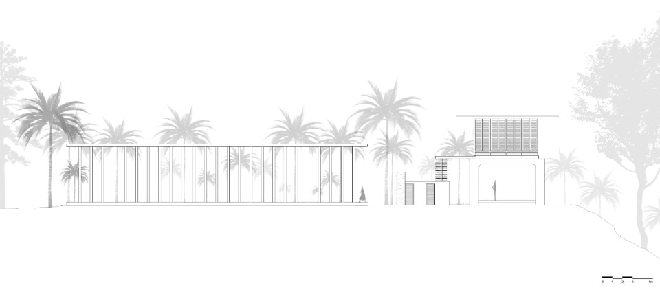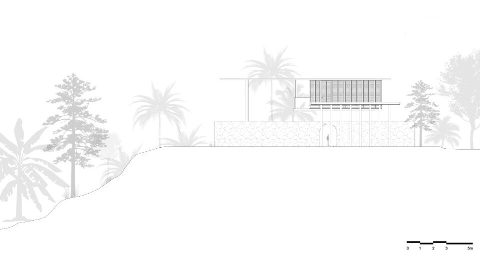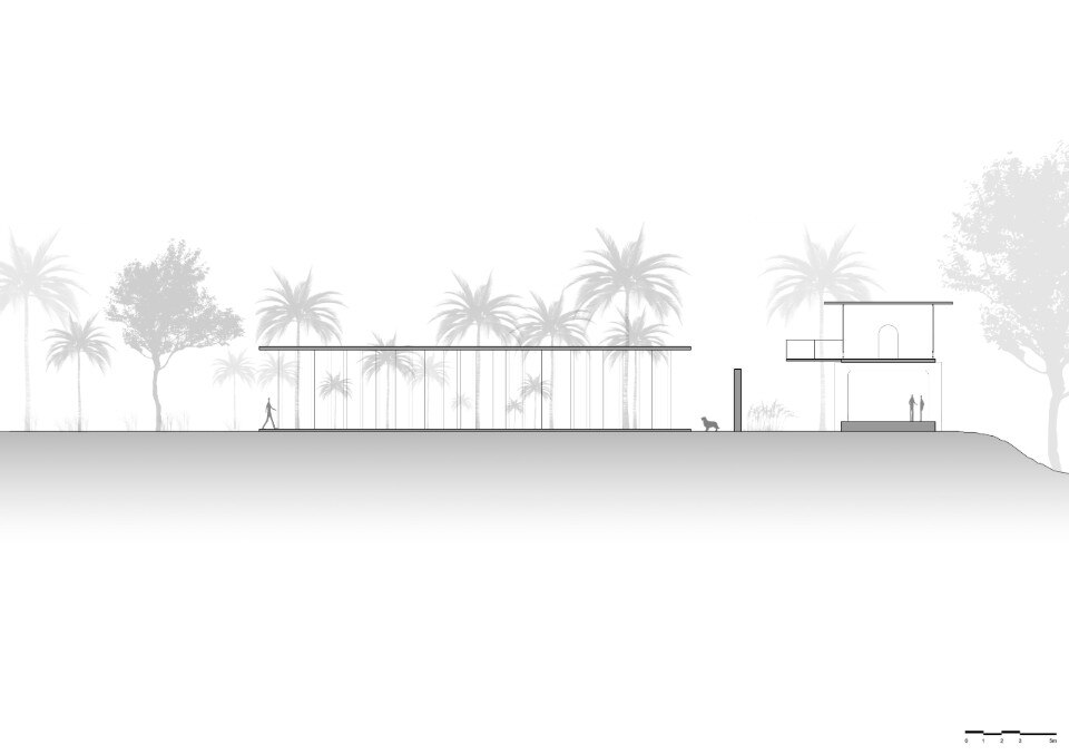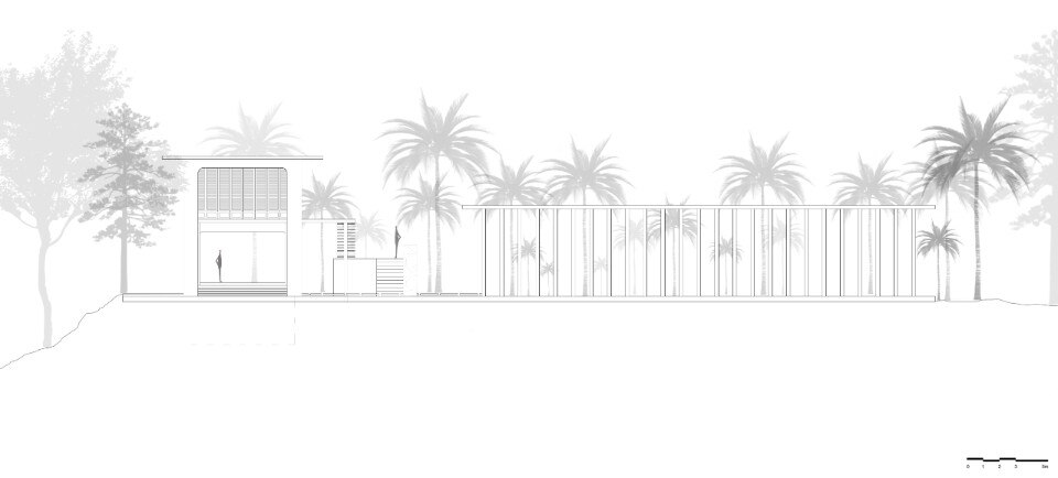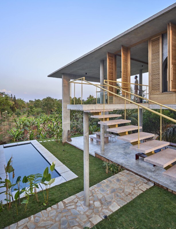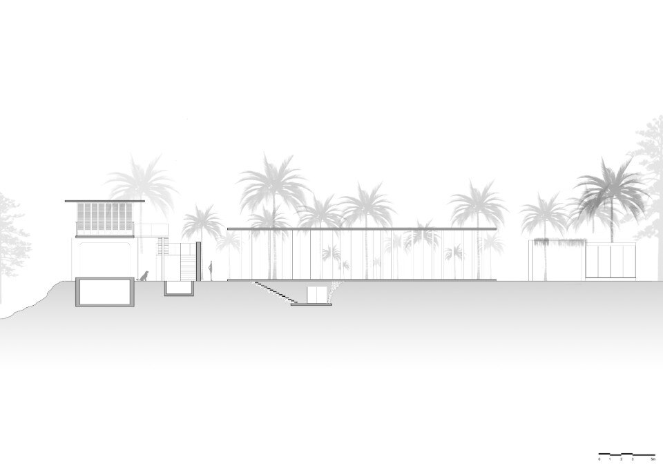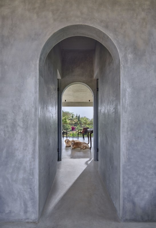 La residenza principale, sviluppata su due livelli connessi da una scala esterna, si caratterizza per una struttura in calcestuzzo al piano terra priva di pareti che serve da patio e sorregge il volume del primo piano. Questo è invece un ambiente permeabile che sfrutta ventilazione e illuminazione naturali, abbinando il cemento al legno delle persiane, ed è scandto all’interno da una serie di archi che aggiungono fluidità allo spazio.