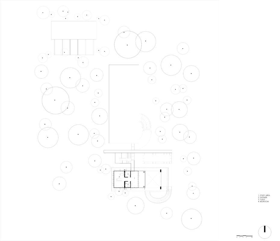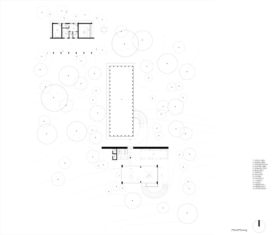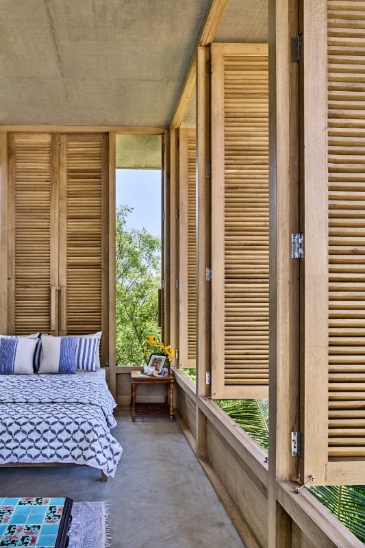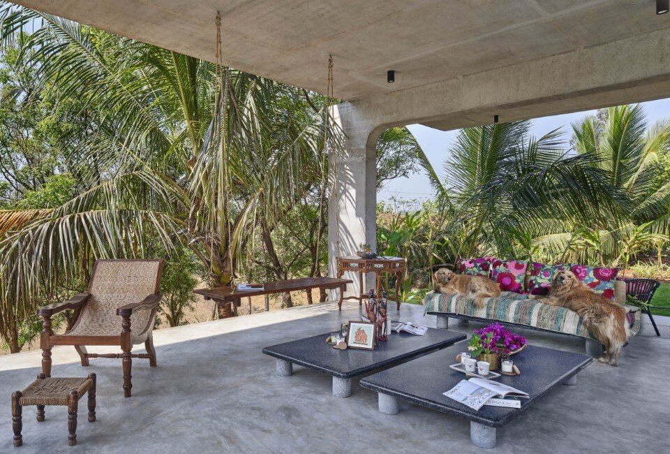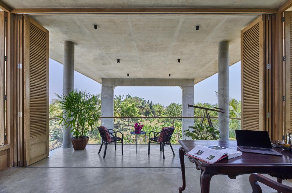 La residenza principale, sviluppata su due livelli connessi da una scala esterna, si caratterizza per una struttura in calcestuzzo al piano terra priva di pareti che serve da patio e sorregge il volume del primo piano. Questo è invece un ambiente permeabile che sfrutta ventilazione e illuminazione naturali, abbinando il cemento al legno delle persiane, ed è scandto all’interno da una serie di archi che aggiungono fluidità allo spazio.