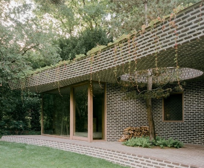 L’estensione, un rimando all’architettura del progettista svedese Sigurd Lewerentz, procede verso il giardino abbattendo le barriere tra interno ed esterno: un volume bivalente, che combina linee curve e rette, simmetriche e asimmetriche, ospita nella zona centrale un ampio patio ai cui lati si sviluppano le ali dell’area living e della stanza padronale. Un albero si staglia nel centro, emergendo dal soffitto attraverso un’apertura circolare.