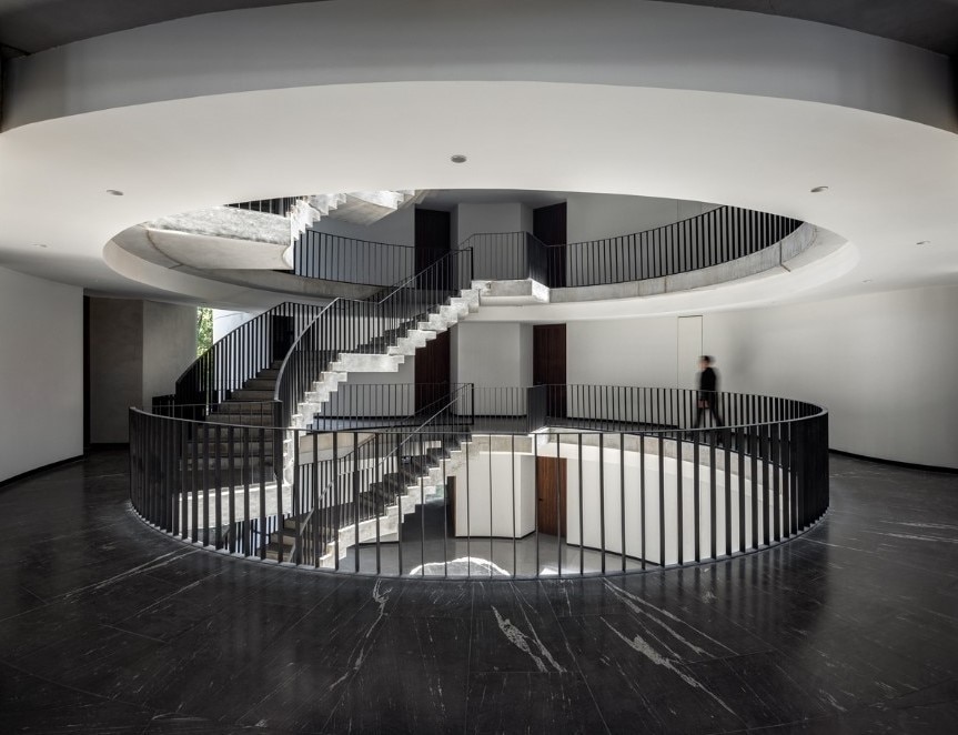 L’atrio circolare a tutta altezza al centro dell’edificio è lo spazio principale dove confluiscono corridoi distributivi e aree comuni, progettato per ospitare una teatrale sosta nel movimento da e verso le residenze. Le sue vertiginose proporzioni confluiscono prospetticamente verso il lucernario e verso la composizione di monoliti di pietra adagiati invece sul pavimento. Il tetto giardino in copertura è suddiviso attraverso aiuole in porzioni private e aree collettive, ombreggiate con alberi da frutto.