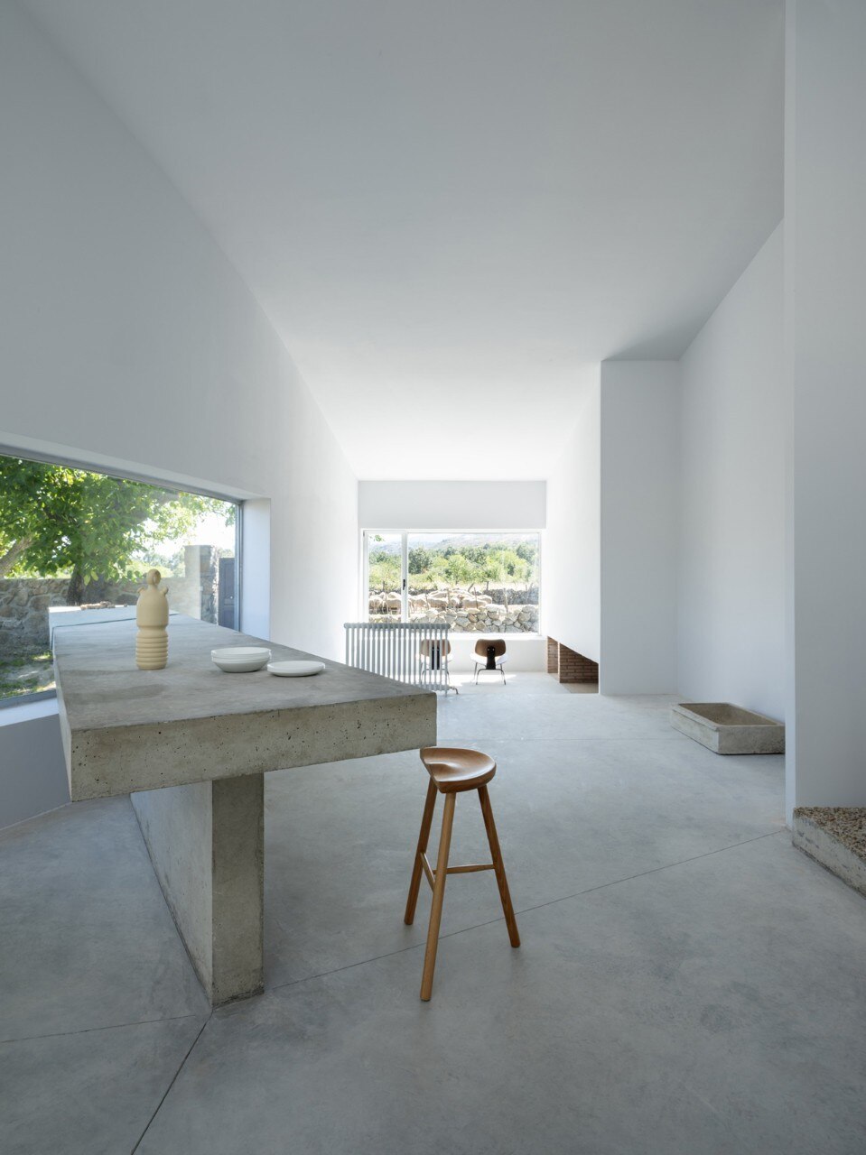 Raúl Almenara ha disegnato Casa Nogal, un’abitazione di campagna ad Avila, come una grande pietra nel paesaggio rurale che flette uno dei suoi lati per lasciare spazio al maestoso albero di noce nel cortile. La geometria legge le trame poderali dei terreni agricoli circostanti, andando ad attestarsi su entrambe le strade che lambiscono il lotto. In sezione, il volume è lavorato con un'unica falda che, da un lato, reinterpreta le costruzioni vernacolari locali; dall’altro, attraverso un netto taglio stereometrico, accentua la percezione monolitica. Il risultato è la nascita di un interessante rapporto dialettico, materico e formale, con il noce, che qui ha sempre regnato, e il muro di sasso del cortile. Gli unici materiali che si aggiungono al granito locale che riveste completamente l’abitazione, porta di ingresso compresa, sono il cemento armato, l’acciaio e il vetro, determinando una palette cromatica neutra in relazione alle tonalità vivaci del paesaggio circostante.
