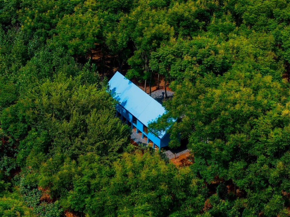 Se della capanna sul lago Walden di Thoureau questa minuta costruzione recupera la semplicità paradigmatica, rispetto all’illustre precedente statunitense l’opera cinese si arricchisce di una tecnologia performante e di suggestioni giocose. L’edificio è costituito dall’assemblaggio di elementi prefabbricati in legno lamellare, progettati e personalizzati digitalmente per realizzare una costruzione interamente assemblata a secco con facilità, in modo da ridurre gli sfridi di materiale e garantire la totale reversibilità dell’opera. Un colore blu squillante pennella le facciate e rimarca vivacemente la presenza dell’opera, quasi come se fosse un giocattolo dimenticato nel bosco.