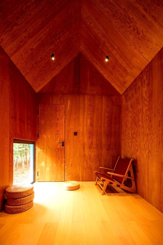 Negli interni, rivestimenti in legno grezzo e pochi selezionati arredi ricordano che non serve molto per sentirsi “a casa”, soprattutto quando si dispone di un confortevole riparo e quando l’unico suono che si ascolta è quello del vento, degli uccelli e degli insetti.