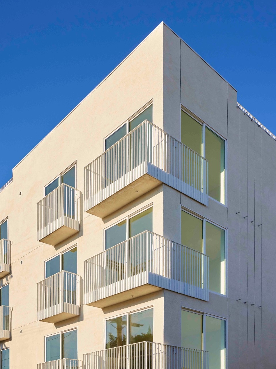 Domina il bianco delle facciate che sono state proporzionate con rapporti armonici e, in attesa di una vegetazione rampicante prevista che animerà e proporzionerà alcuni brani esterni e tutta la corte interna, le porte verde salvia e i soffitti rosa antico temperano il gioco di chiaroscuri che dialogano con l’azzurro profondo del cielo californiano. Sotto questo cielo, sul tetto terrazzo comune, accogliente e arredato, si ammira un panorama a 360° con downtown e i suoi grattacieli a sud, in una cornice continua fatta dai profili sinuosi delle colline di Hollywood.