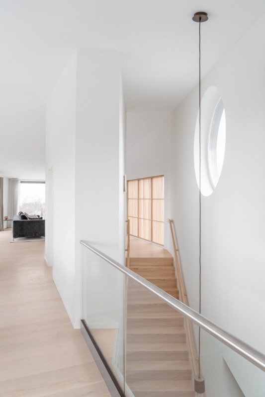 Due grandi caratteri del progetto sono l'abbassamento del tetto verso sud per potersi allineare con la casa adiacente, e la pianta a esagono allungata, in relazione con l’esterno.