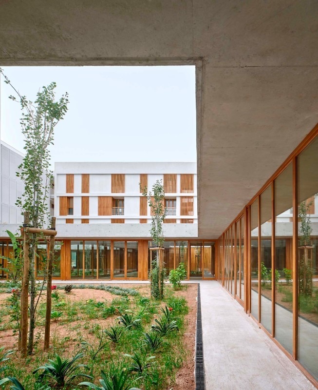 Al piano terra una piastra densa e compatta, rivestita in pietra marés di Maiorca dal tono caldo, ospita gli spazi sociali e commerciali: se dall’esterno il volume appare un involucro massivo e introverso, all’interno si schiude in una sequenza di spazi visivamente interconnessi che ruotano attorno a tre corti verdi perimetrate da ampie vetrate, da cui filtrano luce e ventilazione naturali e che proteggono dal vento e dal rumore, creando oasi pacificanti dal trambusto esterno.