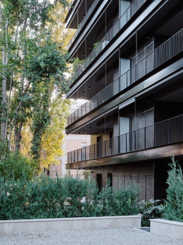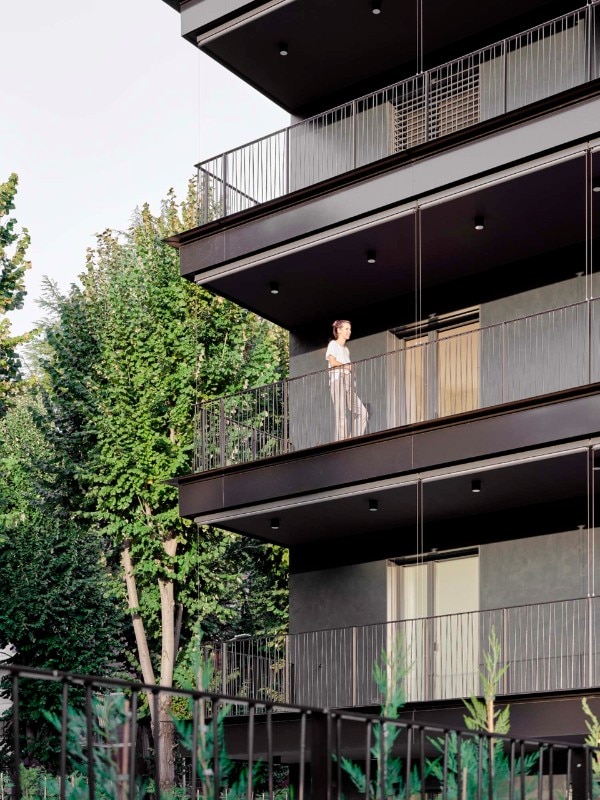 La facciata rivestita in ceramica scura, in dialogo con la luce, è caratterizzata da un linguaggio sobrio ed elegante, vivacizzato dalla ritmica regolare di pieni e vuoti, dove ampi balconi con logge e vetrate contribuiscono a creare una continuità percettiva e fruitiva tra interno ed esterno.