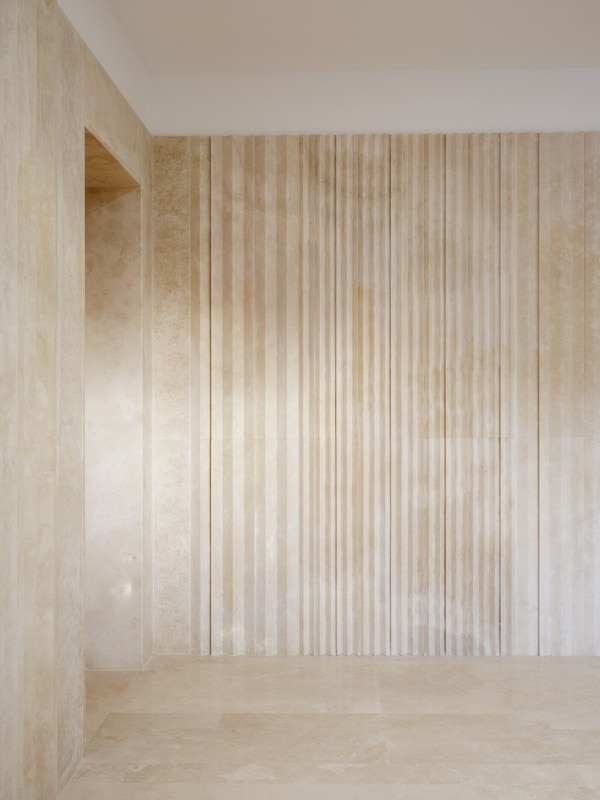 Negli interni, materiali di finitura di pregio (dal legno di rovere negli infissi, al travertino nei pavimenti che si ripropone anche nel viale e nell’atrio di ingresso) impreziosiscono gli ambienti irradiati di luce.
