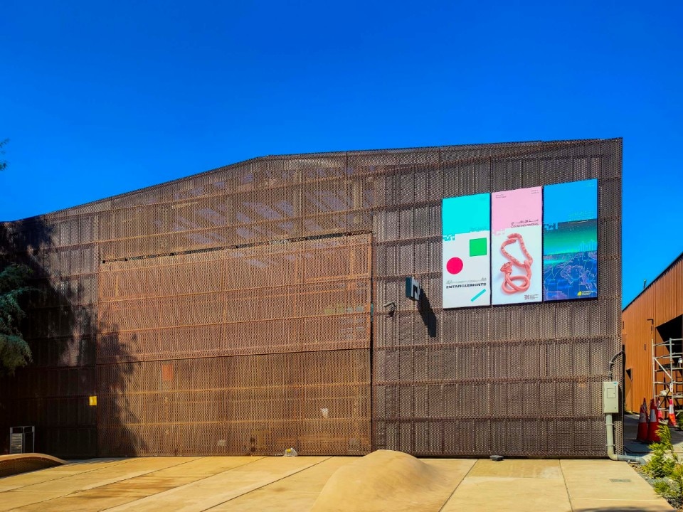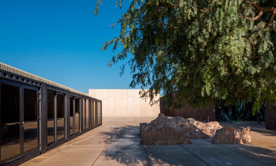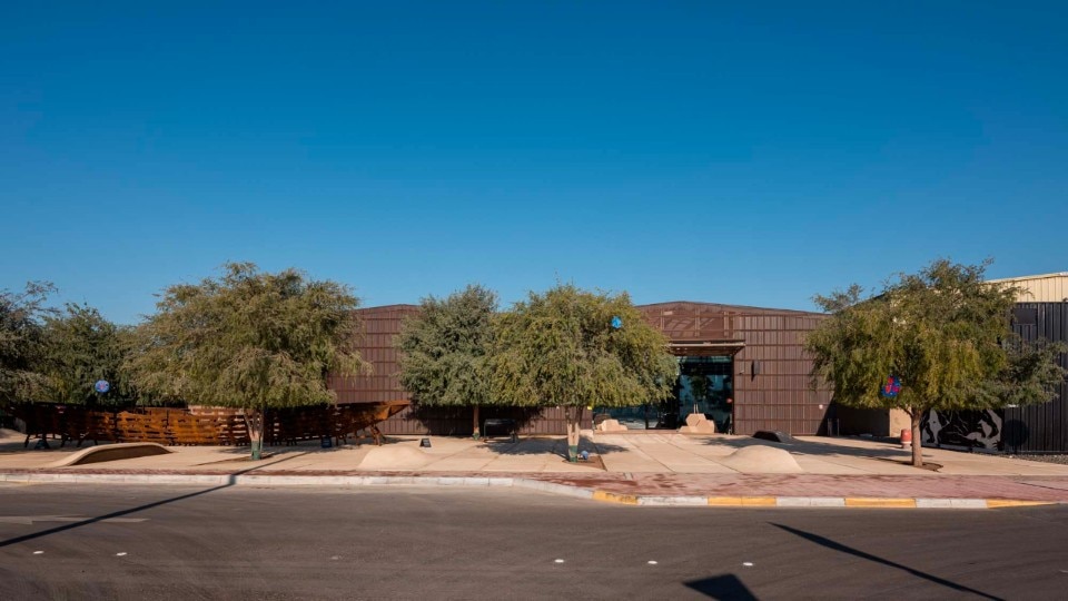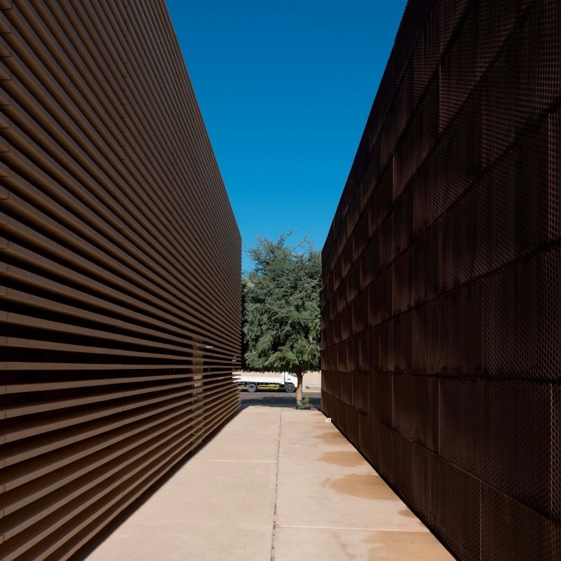 I fabbricati sono avvolti da un involucro in cor-tén traforato che riporta motivi geometrici, come nella tradizionale mashrabiyya, e riecheggia la texture arrugginita dei capannoni circostanti.