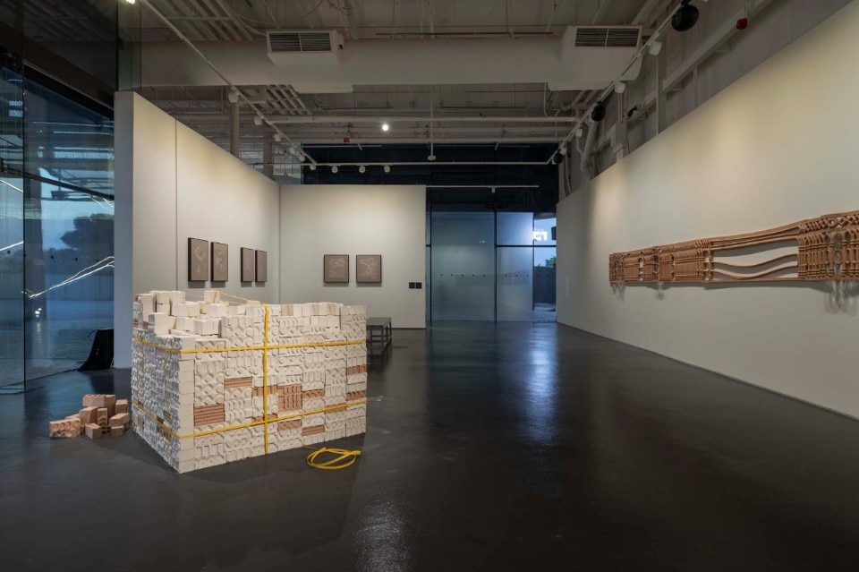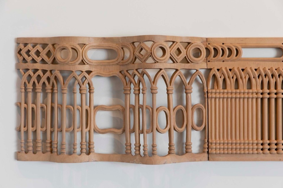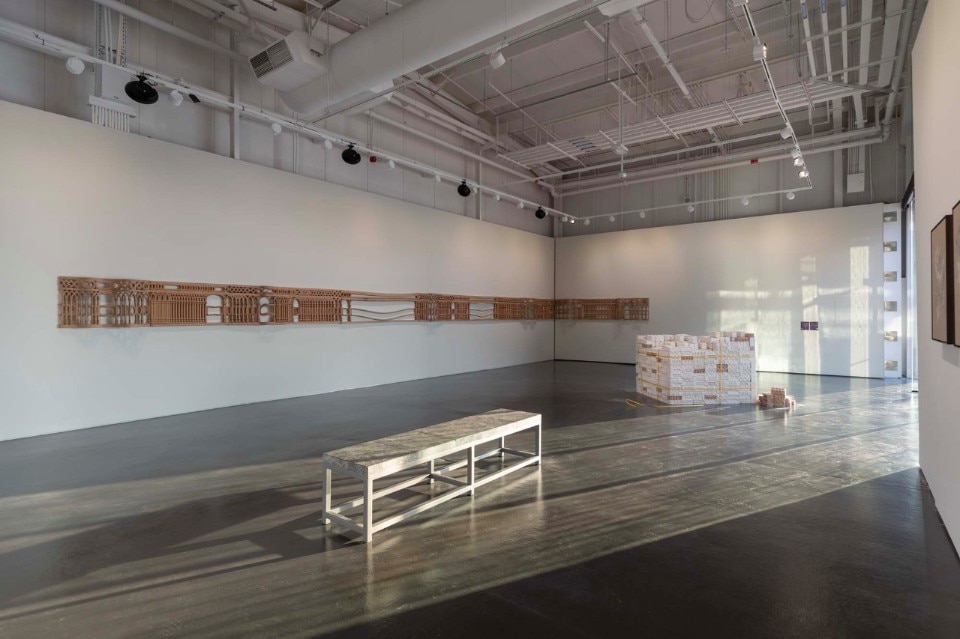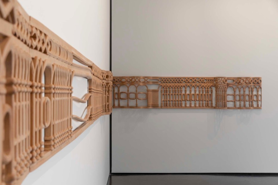 All’interno del centro, le mostre del momento sono due. Nella galleria 1, Asma Belhamar, nella mostra personale (Solid Void), si concentra sul tema dell’identità come rapporto tra passato e presente: un rilievo appeso alla parete in legno intagliato propone un tradizionale fronte islamico, reinterpretato nella variazione delle trame per suggerire la distorsione che deriva da una percezione in movimento, come da una linea dell’Alta Velocità che sfreccia di fianco a un contesto storico (Vision on the Periphery).