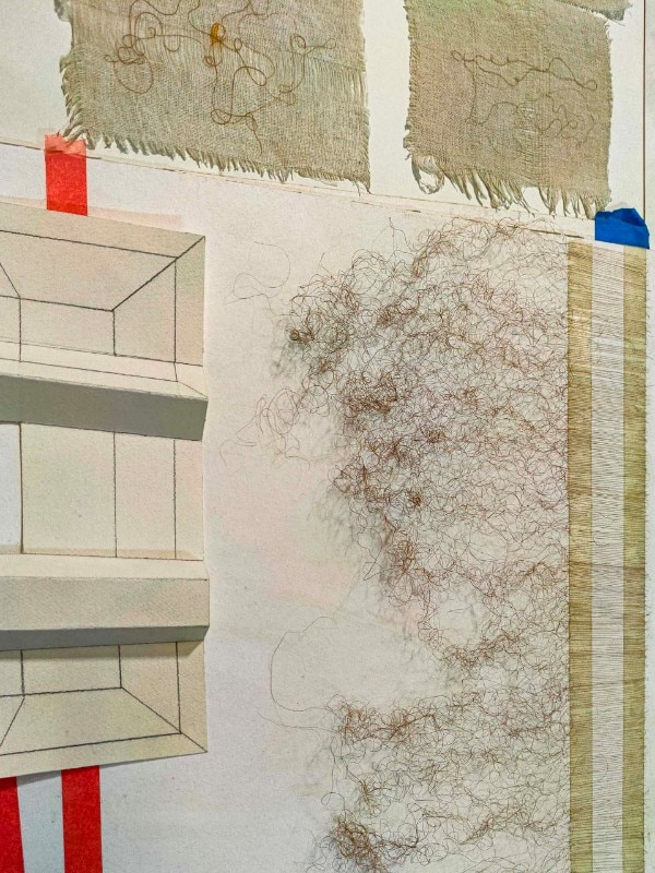 In un comparto industriale lambito da una terra arida che già prelude al deserto, Afra Al Dhaheri parla nel suo magazzino-laboratorio della sua urgenza di riconquistare un “profumo del tempo” cancellato dalla velocità di passo odierna. Nel progetto “Hair Drawings” elabora il rapporto con il tempo attraverso la materia del suo corpo: i capelli, raccolti e sagomati in un processo lento e meticoloso, rappresentano un frammento di vita che continua oltre il distacco dal corpo, quando disegnano composizioni cromatiche su un foglio di cartone.