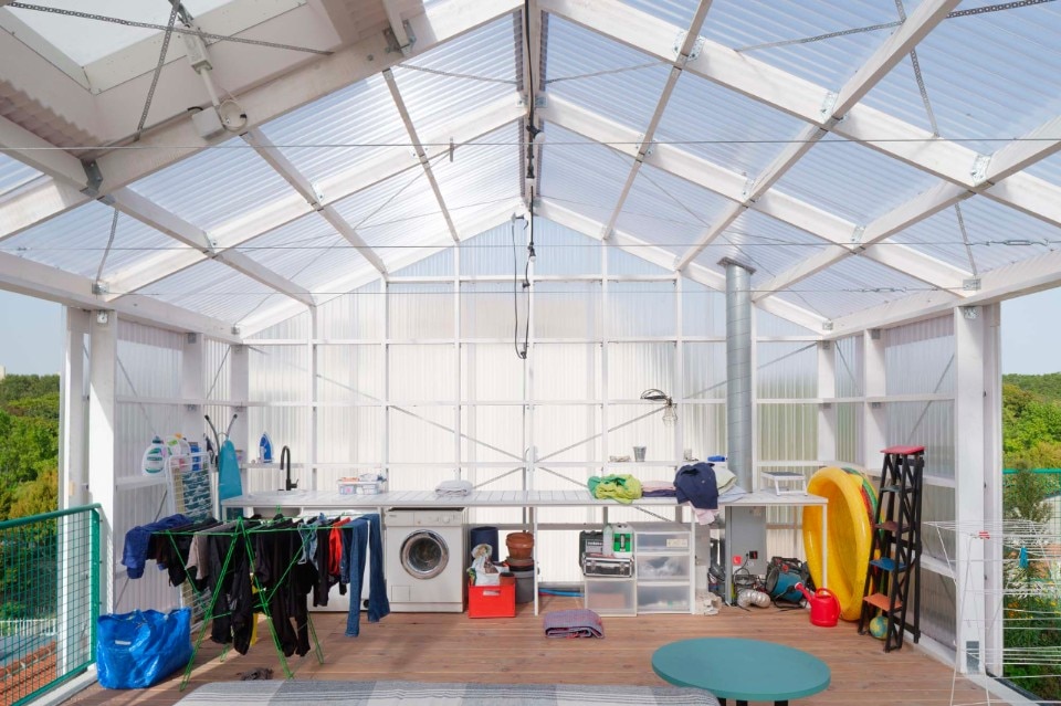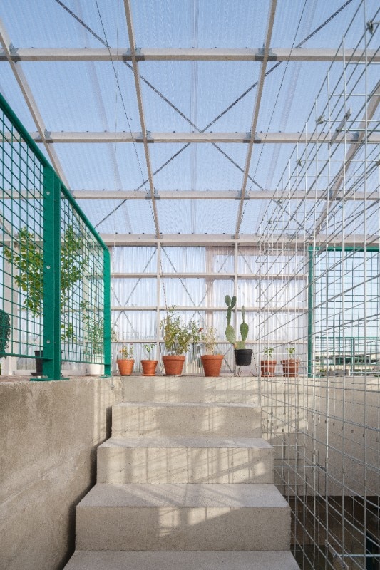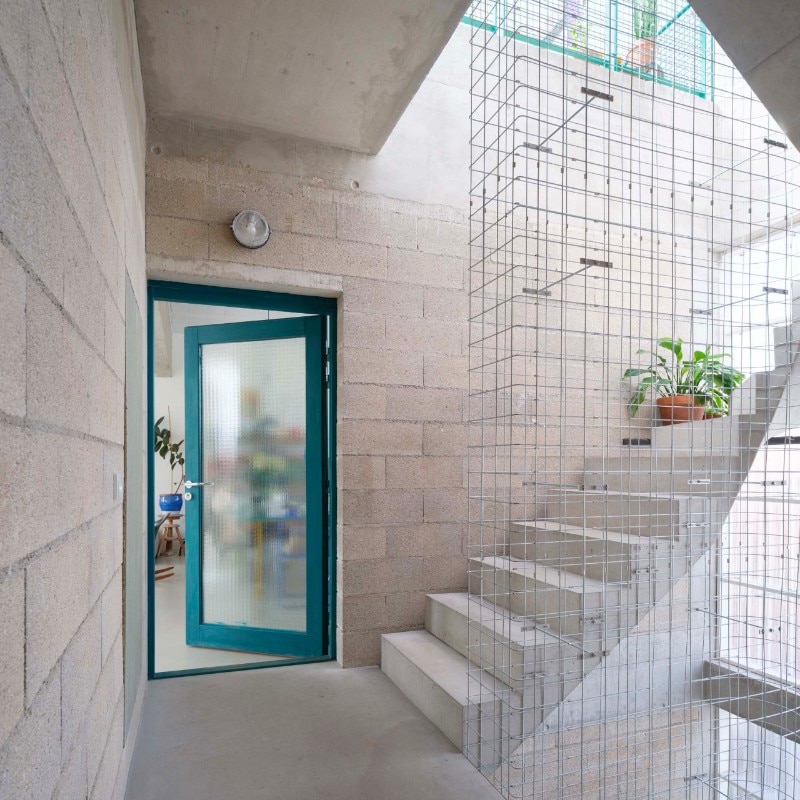 Nonostante gli indici urbanistici consentissero una volumetria di quattro piani, lo studio ha scelto di edificarne solo tre in modo da ridurre l’impatto sugli edifici adiacenti e preservare la restante cubatura per gli spazi pubblici, distribuiti a tutti i livelli. Al piano terra un ambiente polifunzionale, accessibile dalla strada attraverso un portone trasparente, mette in continuità questo ingresso col giardino sul retro. La scala in cemento gettato in opera e protetta da una rete metallica conduce ai piani degli appartamenti, dove porte trasparenti introiettano la luce dal percorso distributivo ed enunciano un’ideale continuità tra spazio domestico e comunitario. In copertura, la serra che ospita la cucina e la lavanderia offre un luogo di incontro e una vista privilegiata sul paesaggio periferico dalla terrazza panoramica