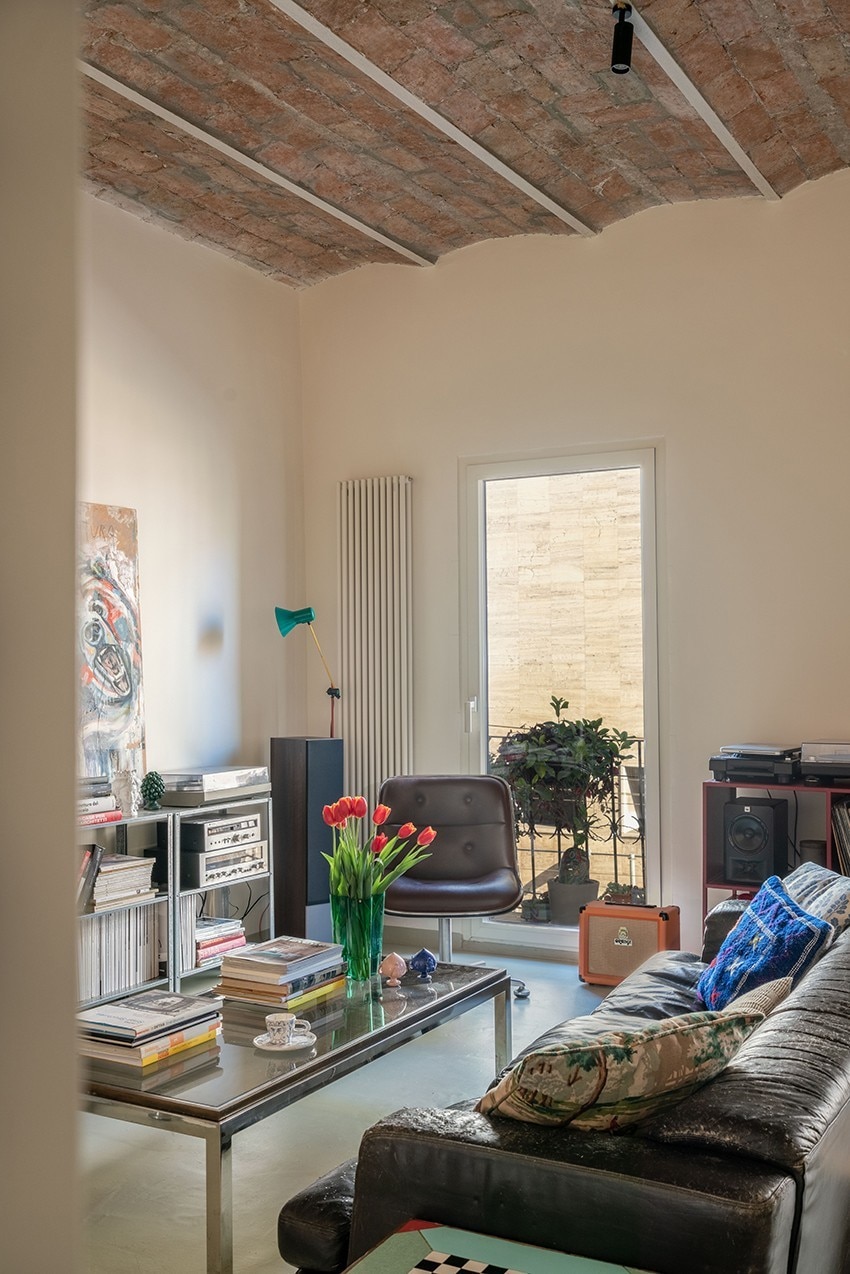 Quello che in precedenza era un buio e angusto appartamento frazionato da tramezze e lunghi corridoi viene riconfigurato da Studiotamat in un loft più spazioso e luminoso. Spariscono partizioni e controsoffitti per creare un nuovo amalgama tra il passato delle antiche voltine in mattoni e il contemporaneo dei pezzi di design, di nicchie, pareti attrezzate ed elementi tecnologici. Queste combinazioni inaspettate interpretano tanto l’indole eclettica dei proprietari, quanto il mix sorprendente di caos e meraviglia, che sono l’essenza di Roma, come racconta l’architetto Matteo Soddu.