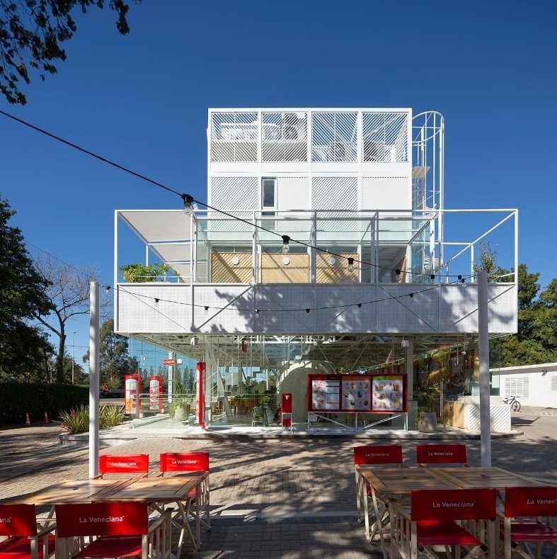 Interamente bianco, il progetto gioca con una trama metallica che pare emanare luce propria. Il piano terra presenta una pianta libera, flessibile, dove poche colonne arretrate caratterizzano lo spazio: due verticali e due dalla forma a V. La facciata vetrata diventa così una facciata espositiva, brandizzata dalla cartellonistica del drive-thru. Spazi di servizio, come i bagni, e l’elemento di risalita delle scale, rimangono poi come corpi autonomi. Distanziati dalla struttura portante, nel caso dei primi, e sollevate da terra, nel caso delle scale.