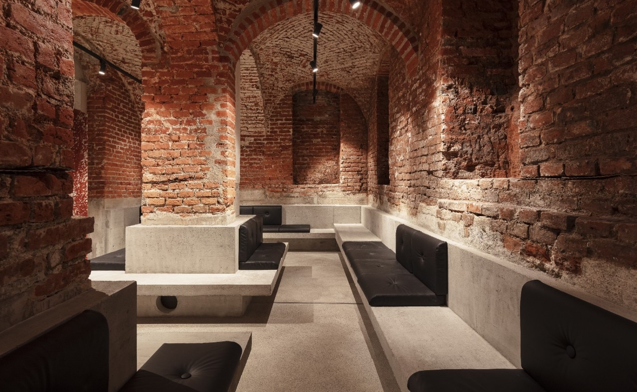 L’area bar vede poi un soffitto in cemento, dove sono installati tutti gli impianti necessari, lasciando intoccate le volte, mentre una tenda in pelle nera, ricavata da avanzi e ritagli della produzione dei rivestimenti, conclude lo spazio.